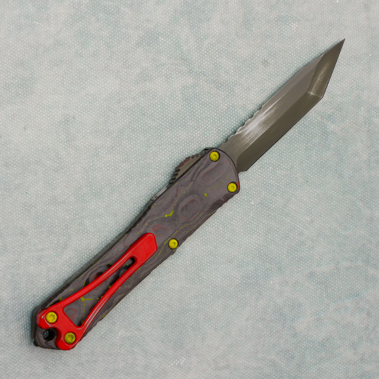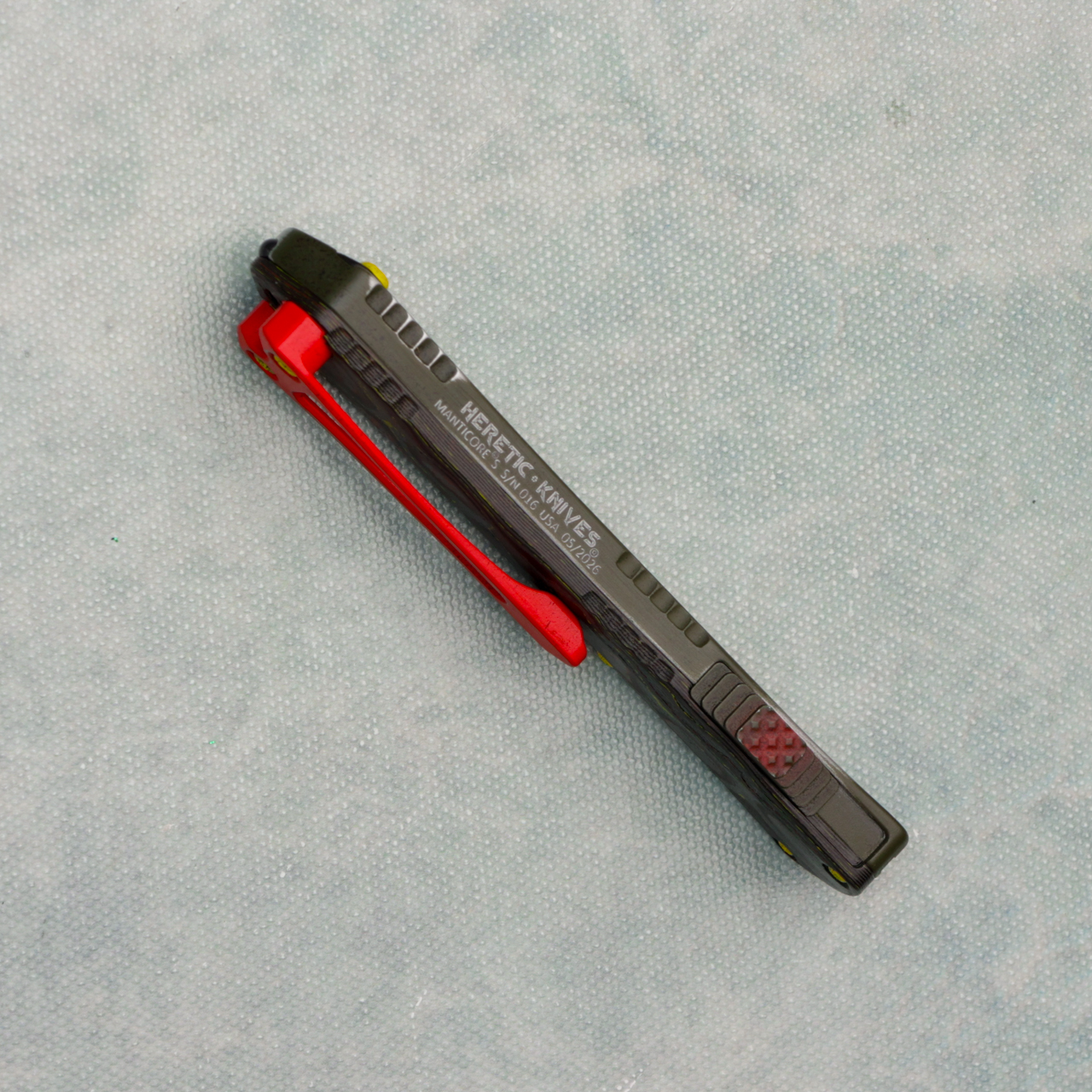 The Heretic Knives Manticore S is a smaller office friendly double action out the front auto with top quality fit and finish and super smooth action! It features a side mounted thumb slide for easy operation. The handle has a subtle contour and jimping around the edges for a secure grip. Complete with a deep carry pocket clip, built in lanyard hole (the handle tapers toward the base), and glass breaker tip. This mini Heretic OTF auto is fantastic!