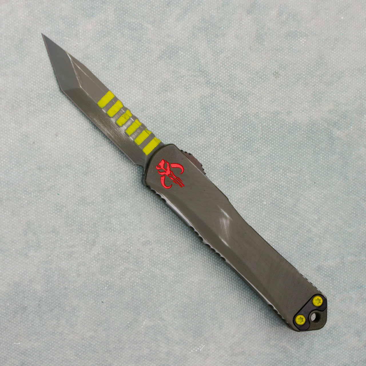 This model features a green bounty hunter theme top scale with a red deep engraved bounty hunter logo and a camo carbon backcover. Tanto bounty hunter Magnacut blade. Yellow finished hardware and red clip. Side is etched with model information and serial number. Comes brand new in box.