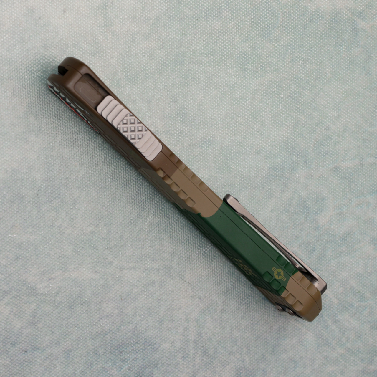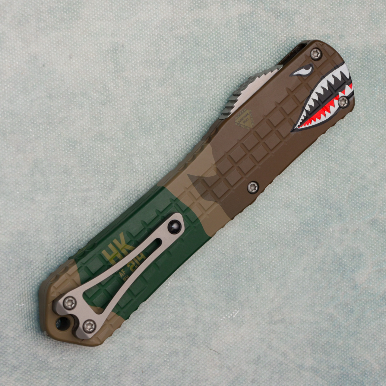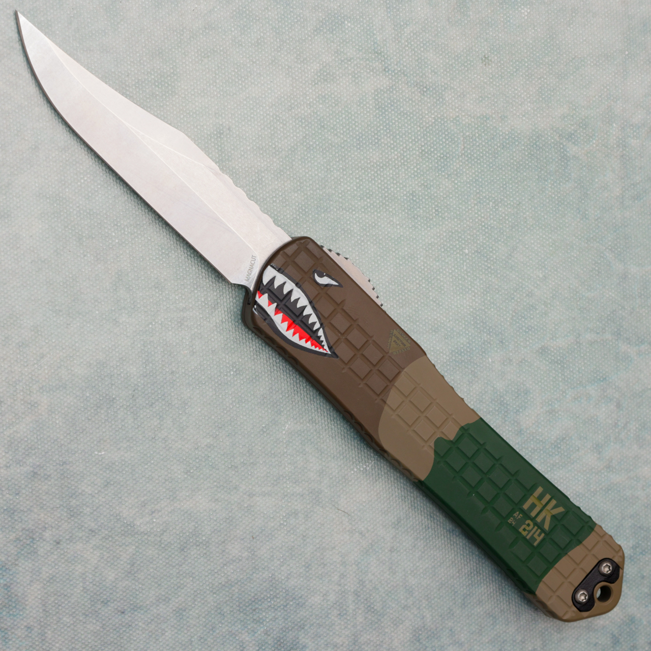 This model features grenade grip frag A-10 motif 6061-T6 aluminum handle scales. Stonewash finished CPM-Magnacut stainless steel bowie blade. Has a minor mark on handle, in box.