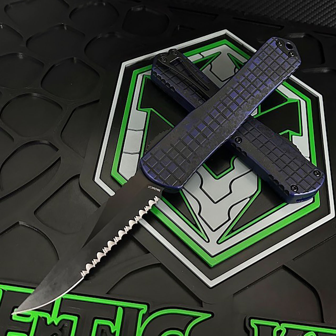 This model features grenade grip frag breakthrough purple 6061-T6 aluminum handle scales. DLC finished CPM-Magnacut stainless steel bowie blade with serrated edge. Brand new in box.