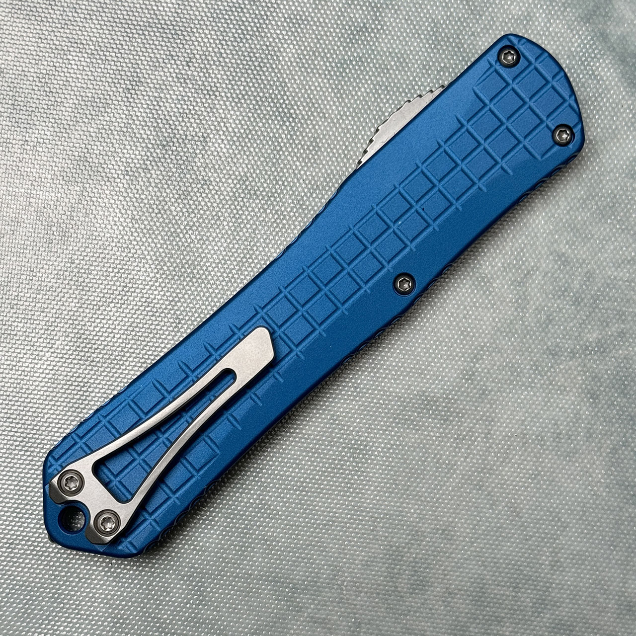 This model features grenade grip frag blue anodized 6061-T6 aluminum handle scales. Stonewash finished CPM-Magnacut stainless steel tanto blade. Brand new in box.