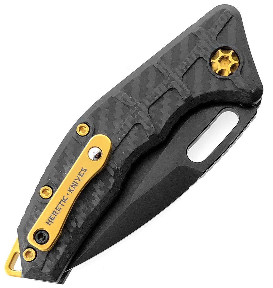 This Martyr Auto model features solid carbon fiber handle scales. Black DLC finished 154-CM stainless steel tanto blade. The blade is etched with the Heretic Knives logo, serial number, and model information. Gold TiNi finished titanium back strap with lanyard hole extension and hardware. Gold TiNi finished titanium pocket clip with rollerball. The pocket clip is etched "HERETIC KNIVES". Brand new in box.