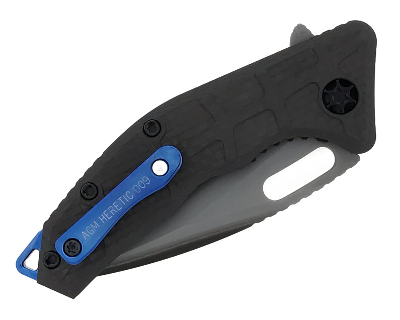 This special Martyr model features carbon fiber handle scales. Polished blue titanium back strap with lanyard hole extension. Polished blue titanium pocket clip with ball bearing in the end. The pocket clip is etched AGM HERETIC 009. Two tone finished double clad san mai steel tanto blade. New in box with Heretic Knives cloth bag.