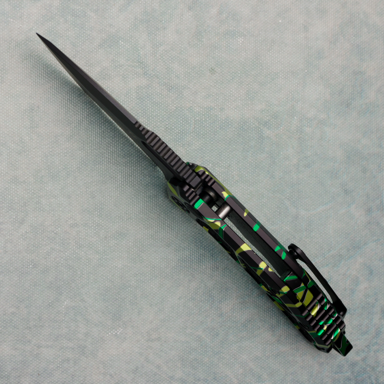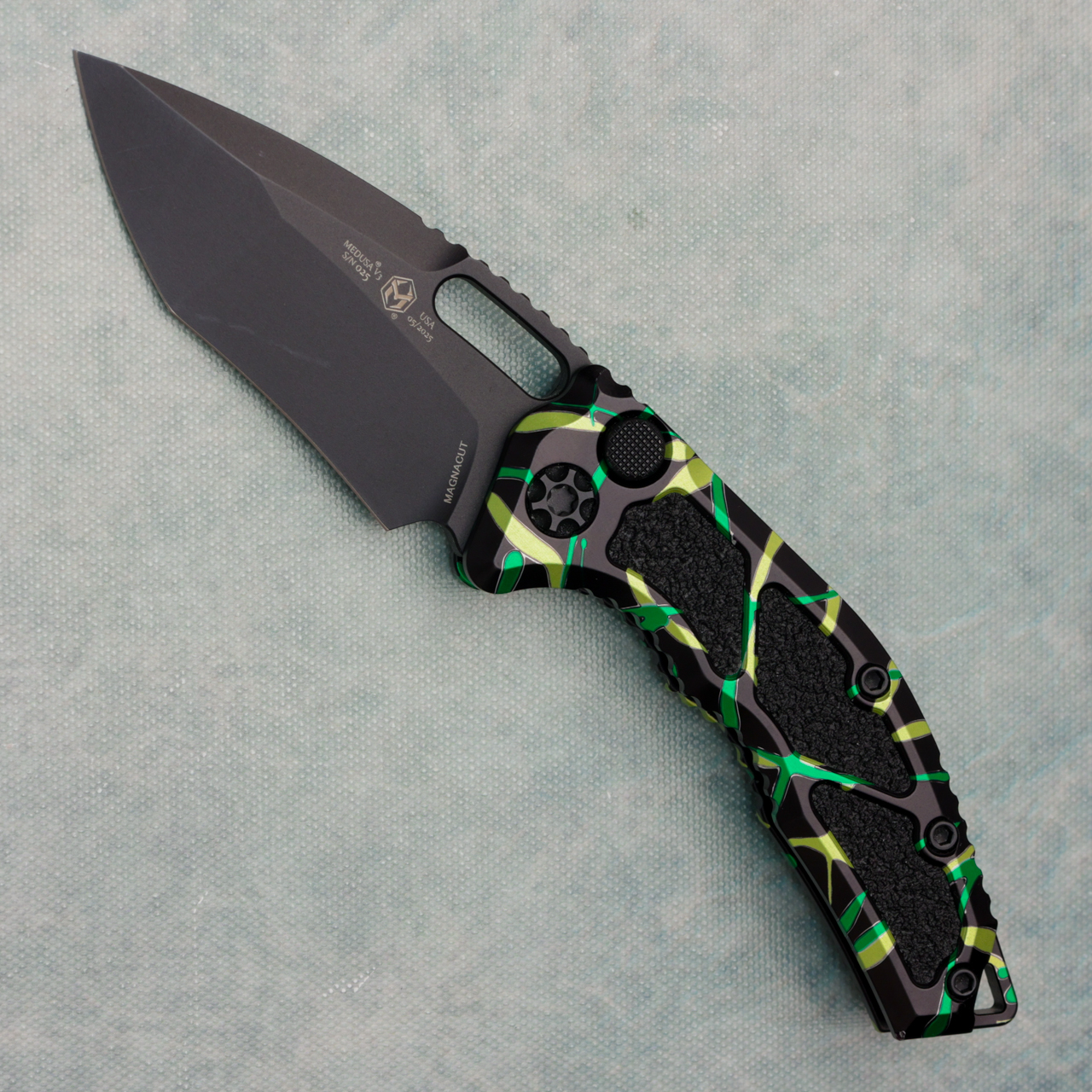 This model features green splash handle scales with black grip tape inlays. DLC Magnacut stainless steel recurve tanto blade. A new and improved version of the Medusa! Brand new in box. Few light marks on blade, and minor pocket clip marks. Comes with box.