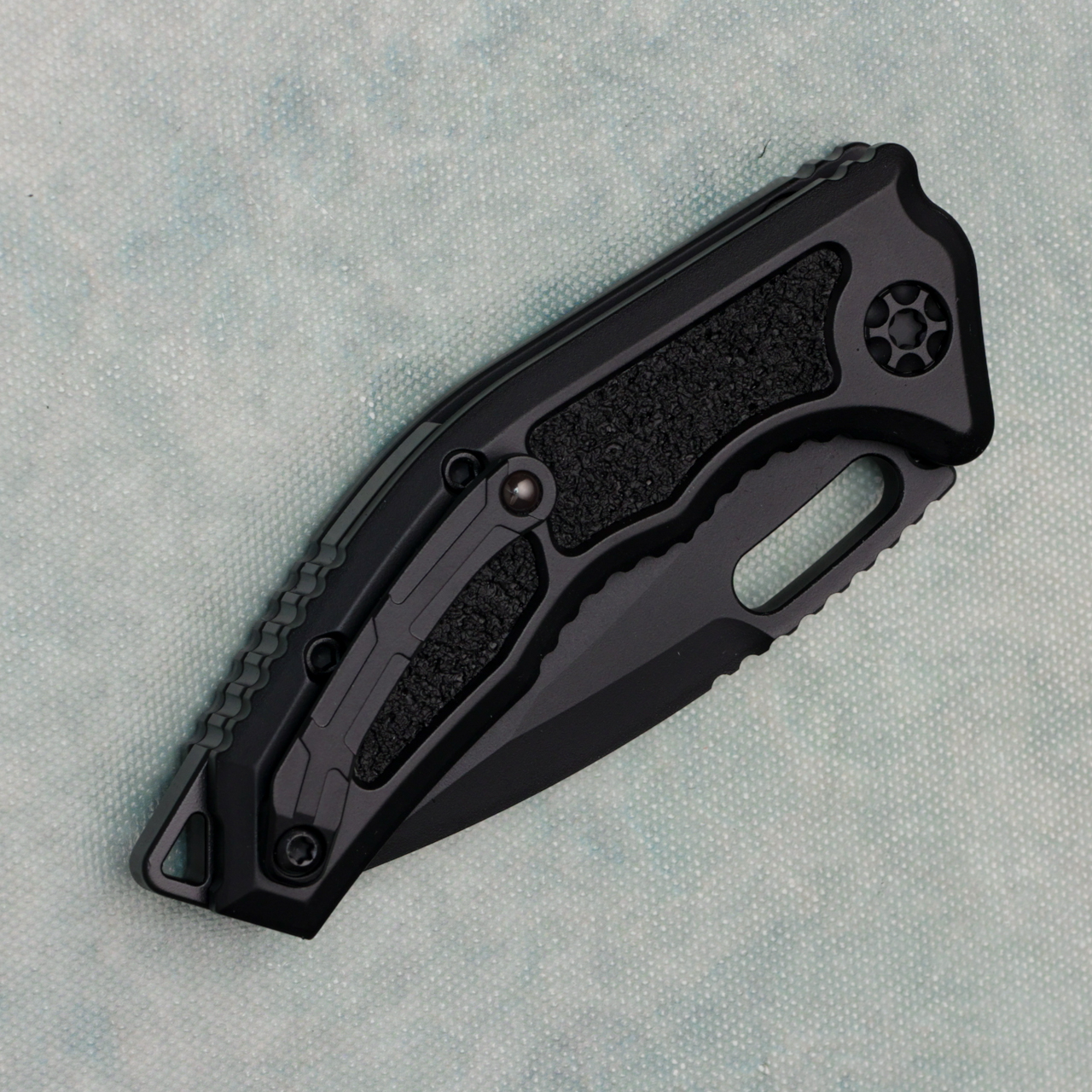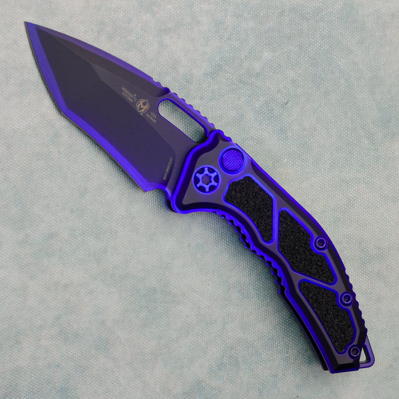 This model looks normal, but give it some UV light and it features secret cel shading handle scales with black grip tape inlays. Matching secret cel shading finished Magnacut stainless steel recurve tanto blade. A new and improved version of the Medusa! Brand new in box.