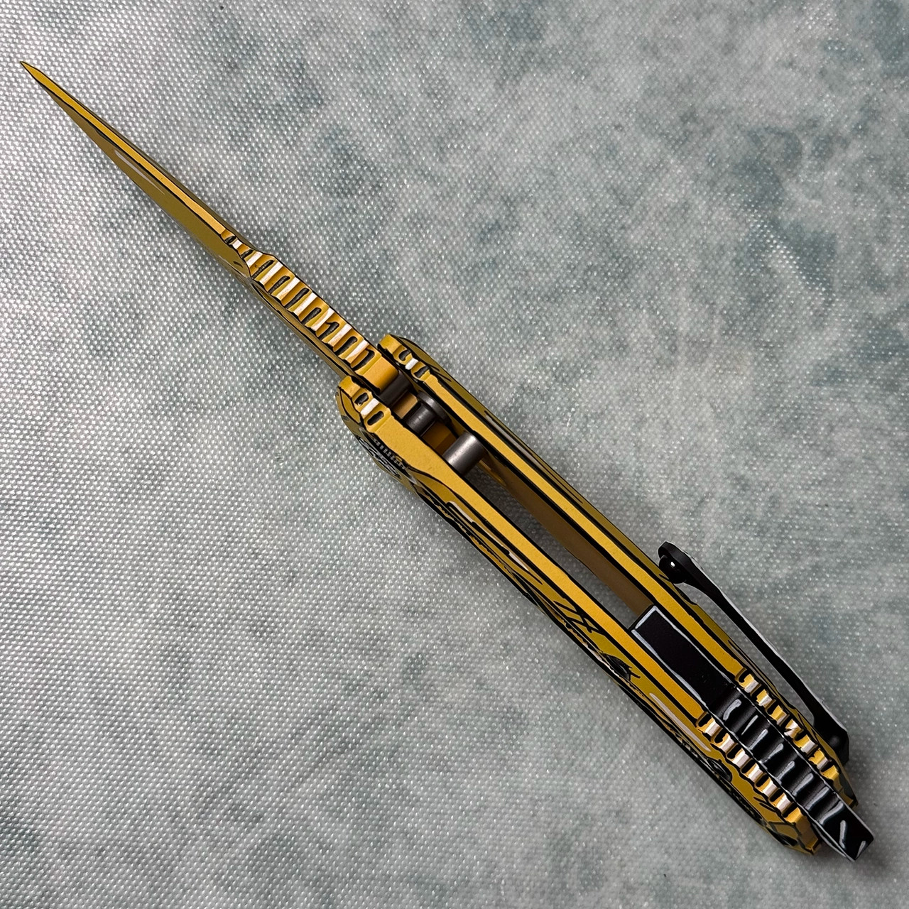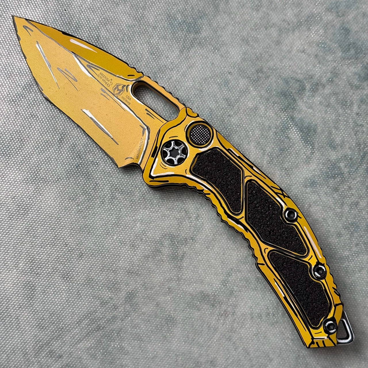 This model features Yellow cel shading handle scales with black grip tape inlays. Yellow cel shading finished Magnacut stainless steel recurve tanto blade. A new and improved version of the Medusa! Brand new in box. LIMIT ONE PER HOUSEHOLD.