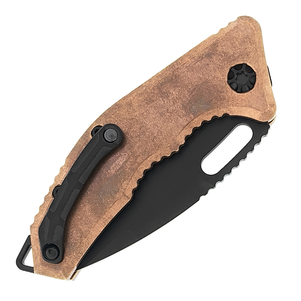 This model features a slab side solid copper handle scales. Black DLC finished CPM-S35VN stainless steel tanto blade. Black finished hardware and pocket clip. The blade has the Heretic Knives logo, model information, and serial number. These are heavy duty! Brand new in box.