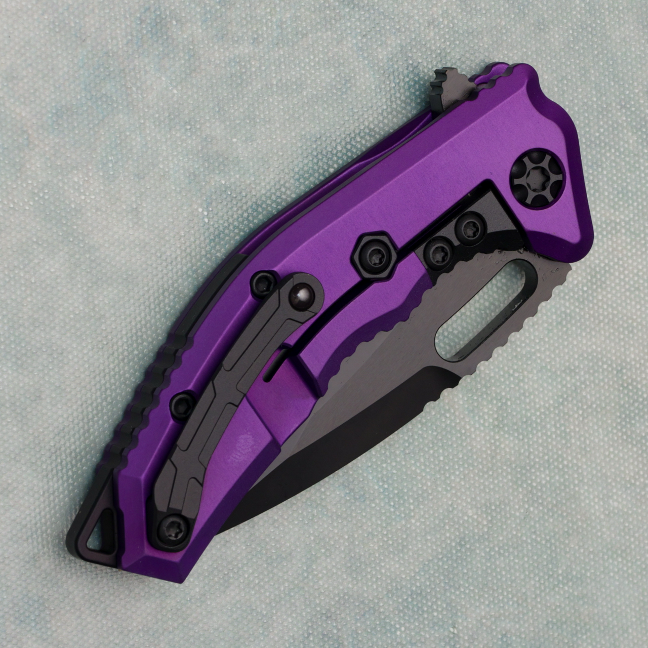This model features purple aluminum handle scales with black grip tape inlays. DLC finished Magnacut stainless steel tanto recurve blade. Black hardware. A new and improved version of the Medusa! Brand new in box.