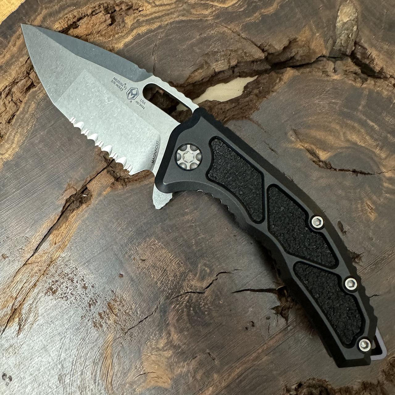 This model features black anodized aluminum handle scales with black grip tape inlays. Stonewashed finished Magnacut stainless steel tanto serrated blade. Satin hardware. A new and improved version of the Medusa! Brand new in box.