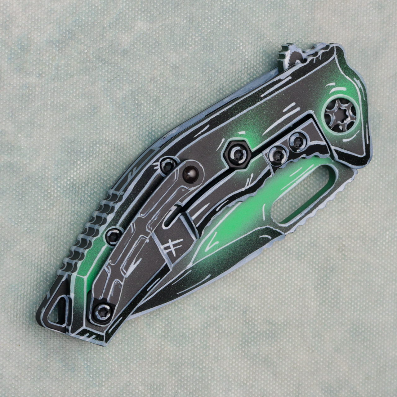 This model features toxic green negative cel shading handle scales with black grip tape inlays. Toxic green negative cel shading finished Magnacut stainless steel tanto blade. A new and improved version of the Medusa! Brand new in box.