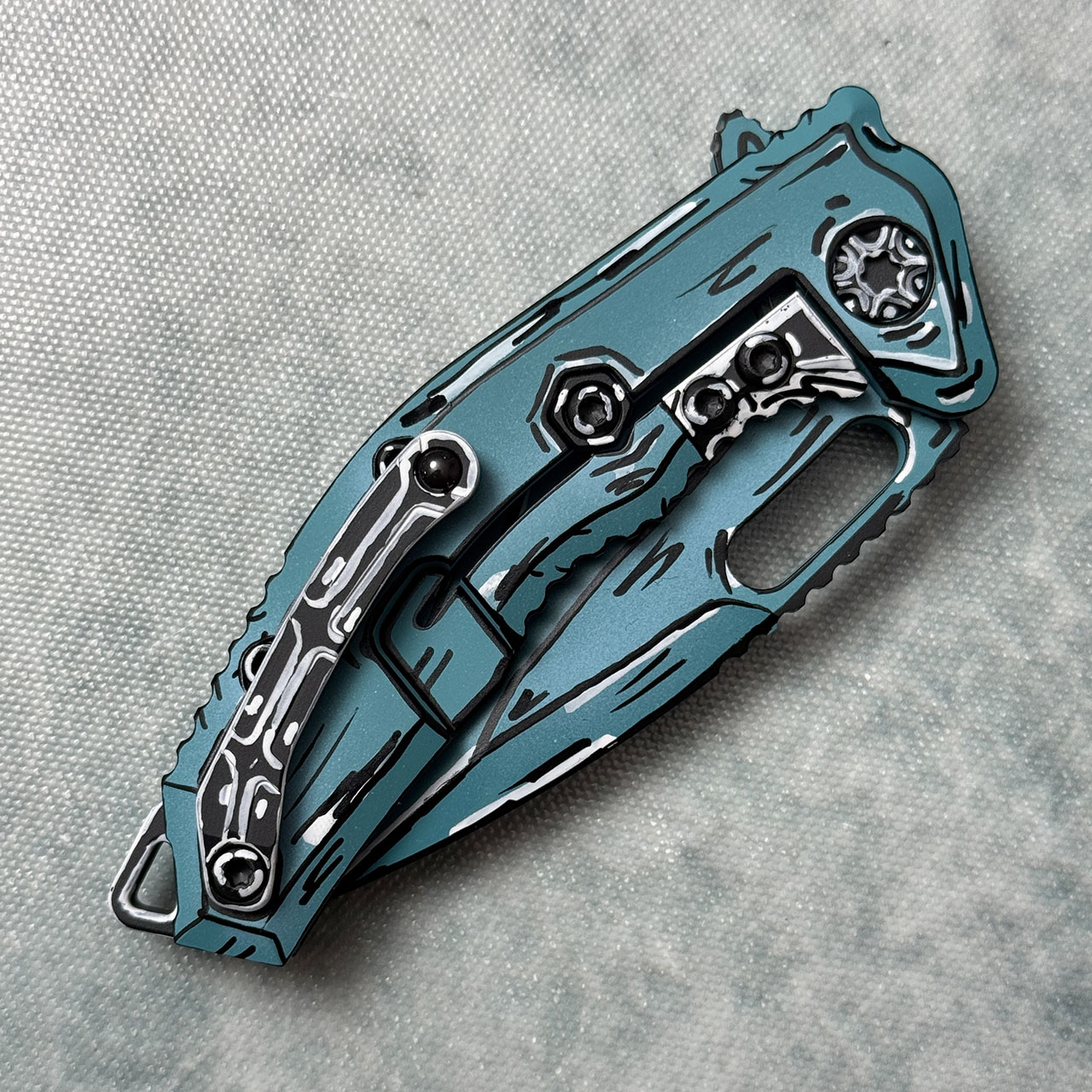 This model features turquoise cel shading handle scales with black grip tape inlays. Turquoise cel shading finished Magnacut stainless steel tanto blade. A new and improved version of the Medusa! Brand new in box.