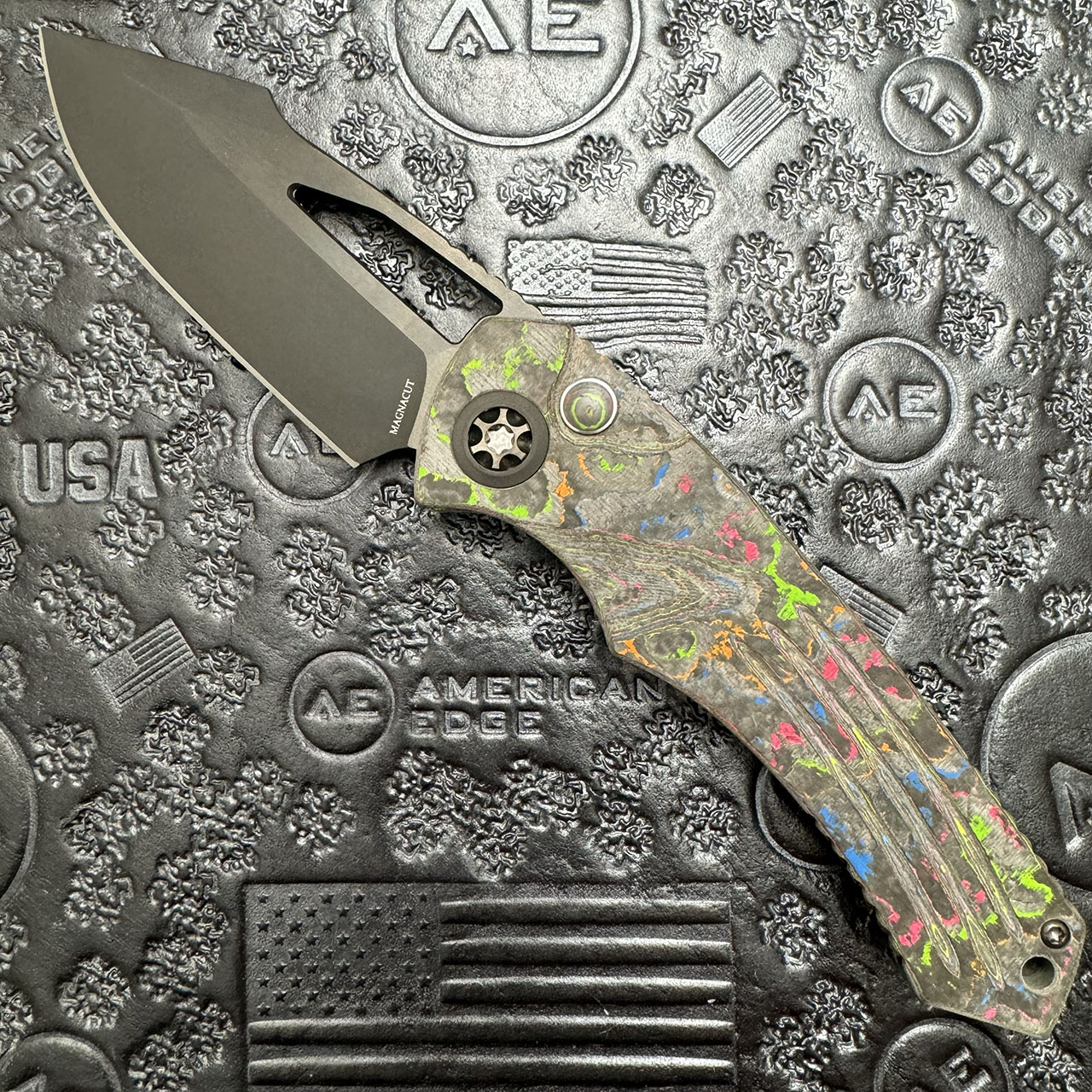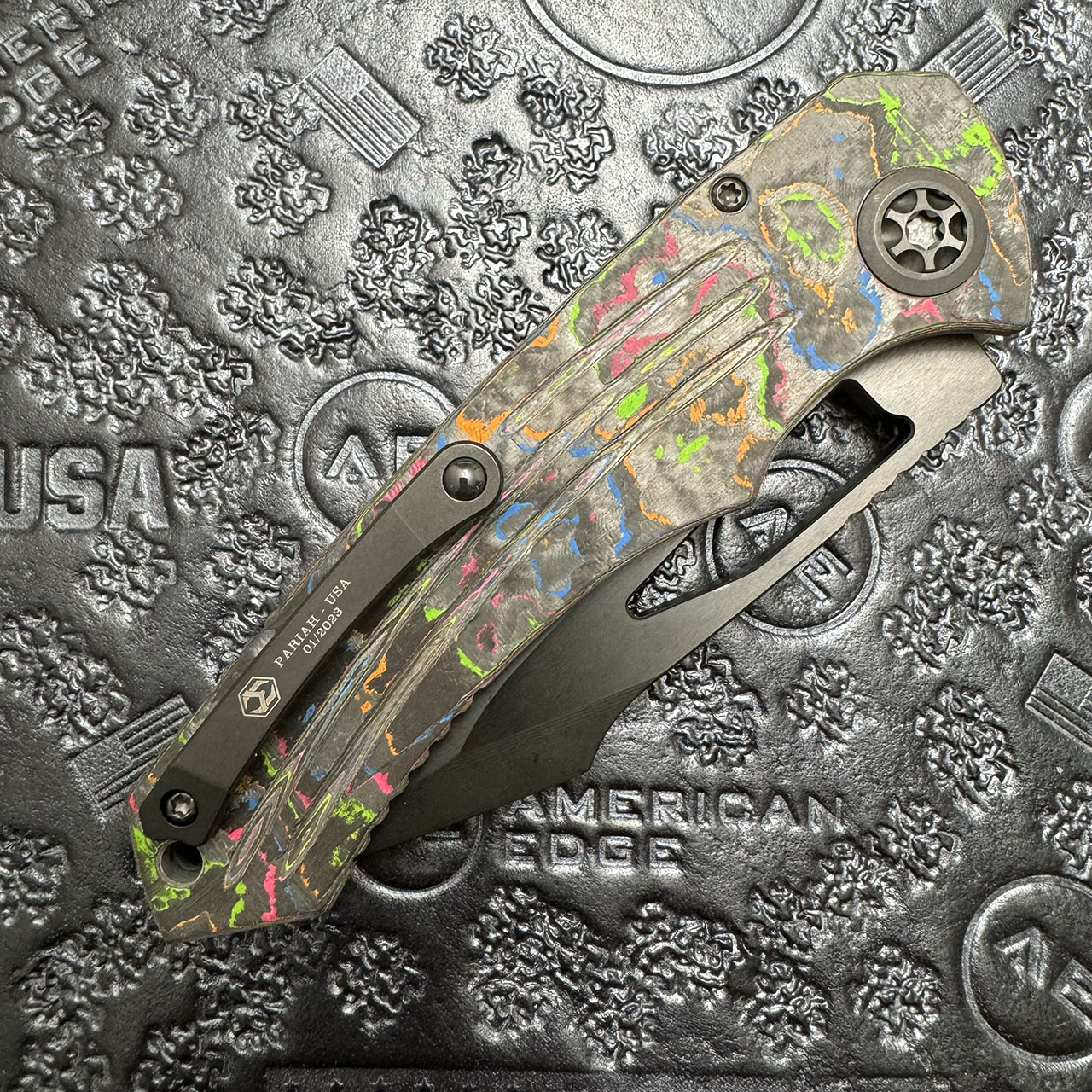This special Iconoclast series button lock manual model features a full awesome 80's camo carbon chassis. DLC finished Magnacut stainless steel blade. Brand new in box with dragon cut bladerunner pouch.