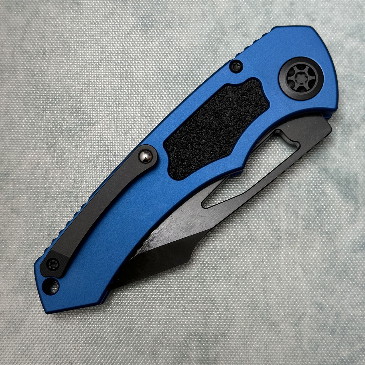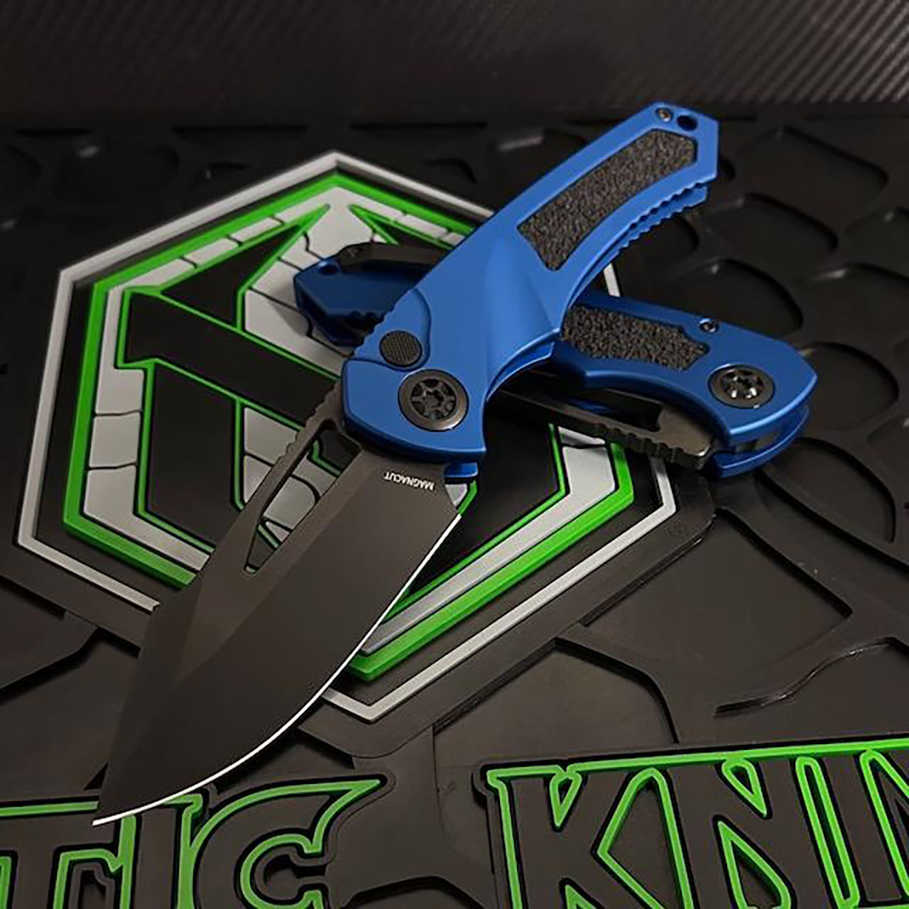 This button lock manual model features a blue aluminum chassis with grip tape inlays. DLC finished Magnacut stainless steel blade. Brand new in box.