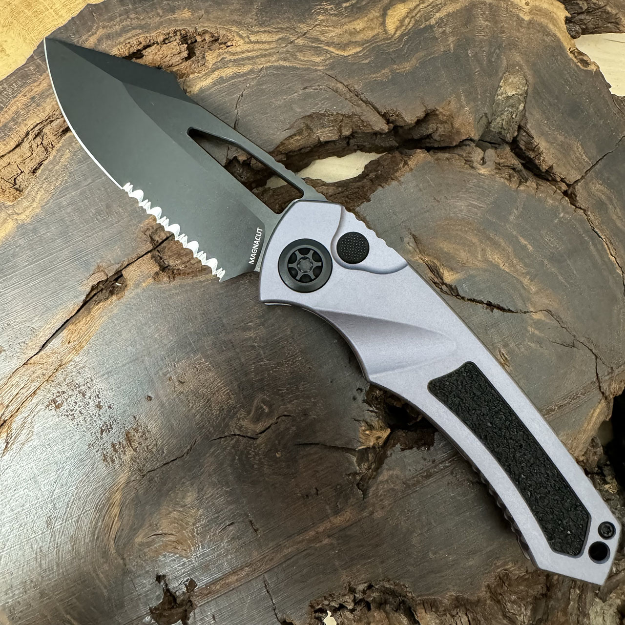 This button lock manual model features a gray aluminum chassis with grip tape inlays. DLC finished Magnacut stainless steel serrated blade. Brand new in box.