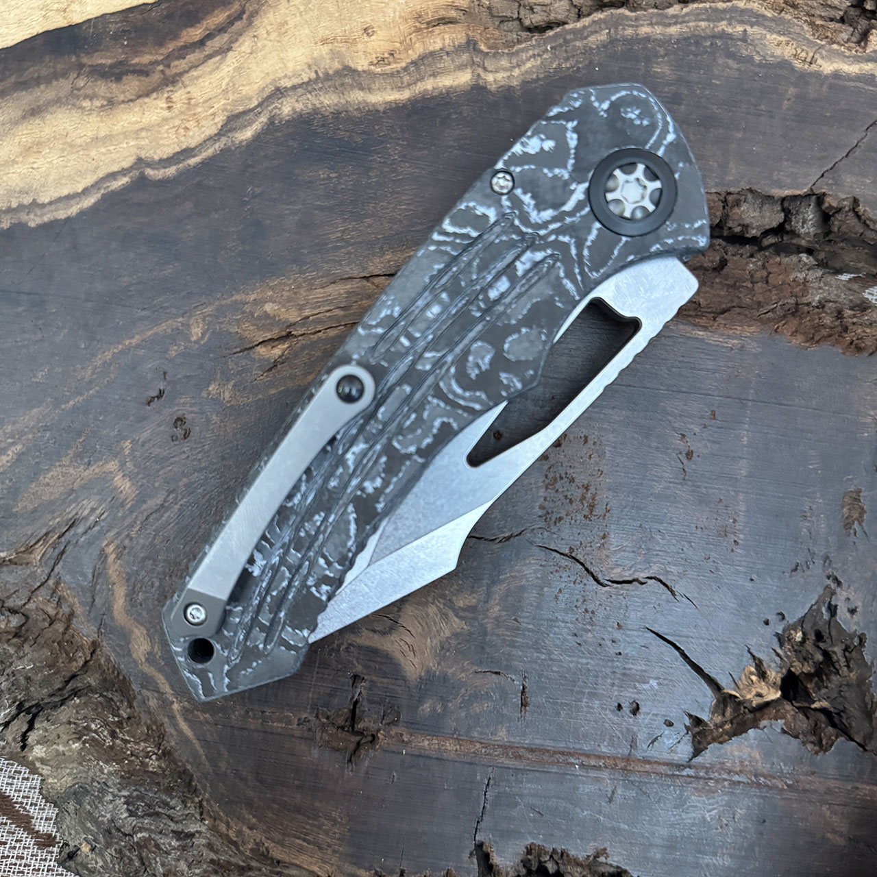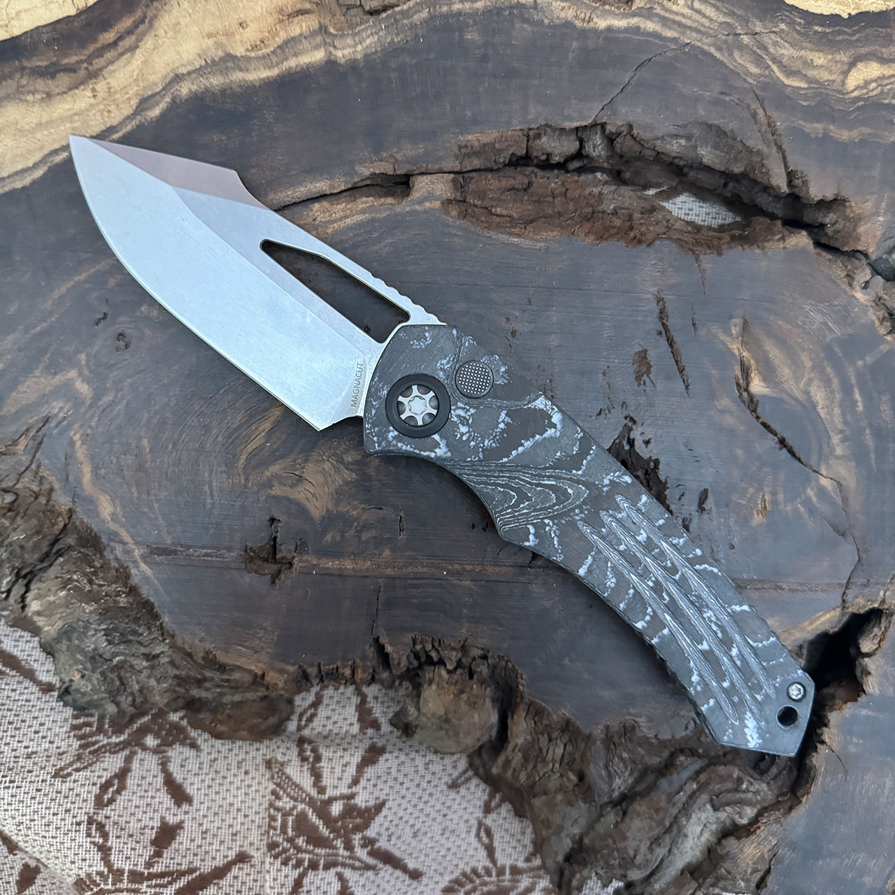This special Iconoclast series button lock manual model features a full white carbon camo chassis. Stonewash finished Magnacut stainless steel blade. Brand new in box.