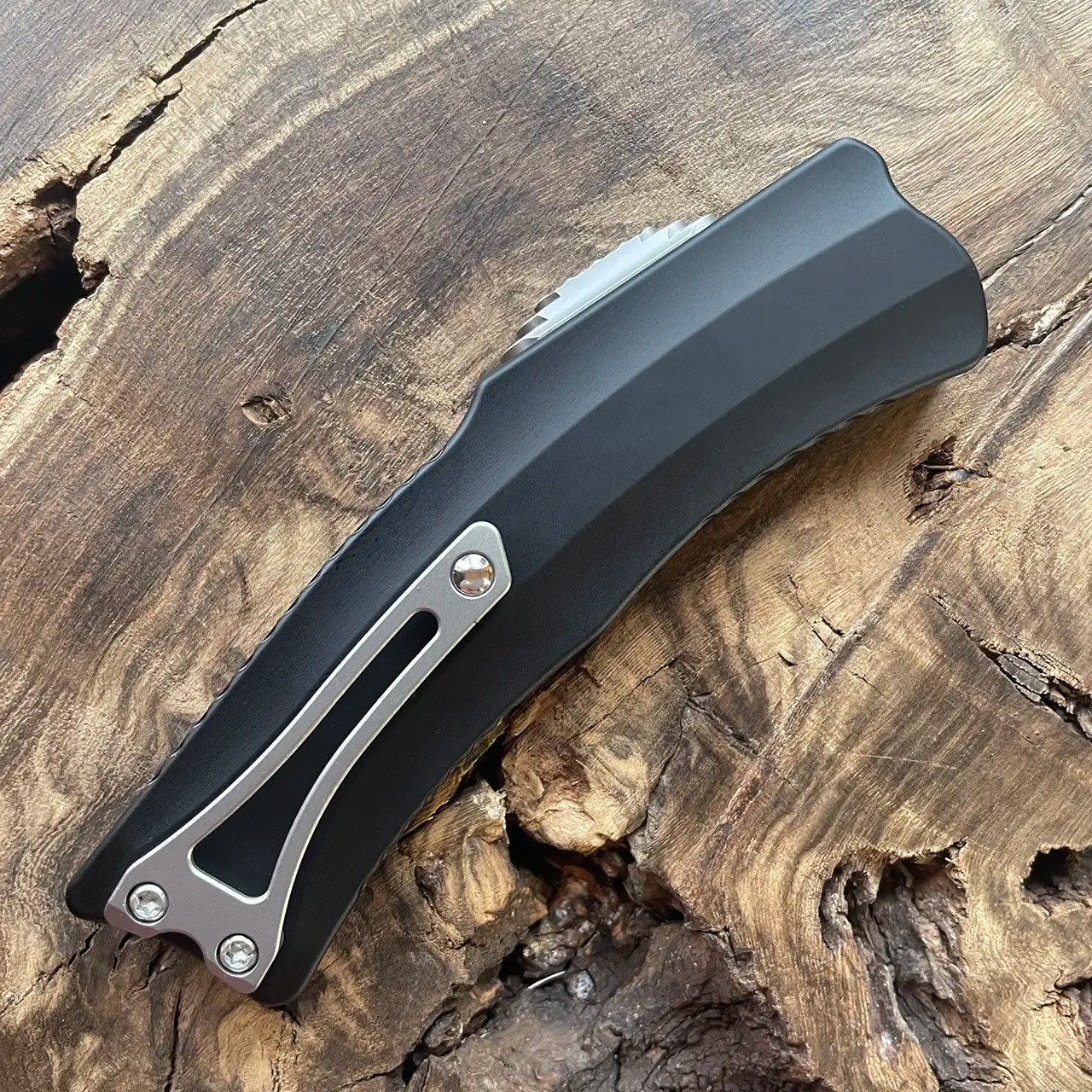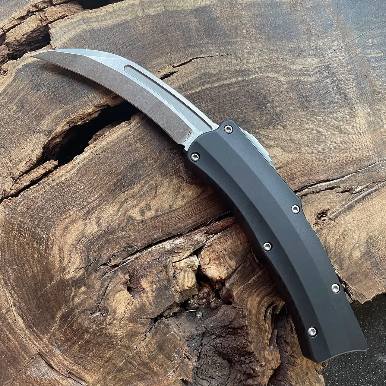 The Heretic Knives ROC (pronounced Ruk) is an out the front auto with unique curved blade. Typical Heretic top notch quality, fit and finish, and super smooth D/A OTF action. It features a side mounted thumb slide for easy operation. The handle is curved to accomodate the hawkbill blade. The first high quality curved D/A OTF auto and it is fantastic. Includes a milled titanium rollerball pocket clip that has a subtle curve to match the handle. This one is sure to turn heads!