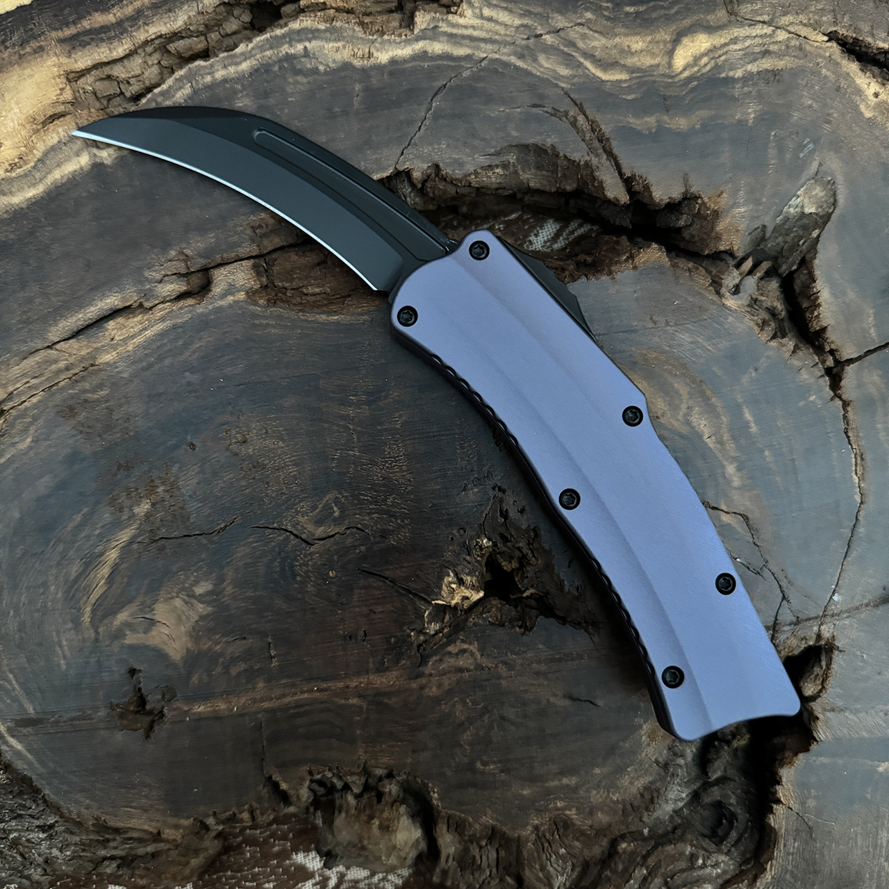 The Heretic Knives ROC (pronounced Ruk) is an out the front auto with unique curved blade. Typical Heretic top notch quality, fit and finish, and super smooth D/A OTF action. It features a side mounted thumb slide for easy operation. The handle is curved to accomodate the hawkbill blade. The first high quality curved D/A OTF auto and it is fantastic. Includes a milled titanium rollerball pocket clip that has a subtle curve to match the handle. This one is sure to turn heads!