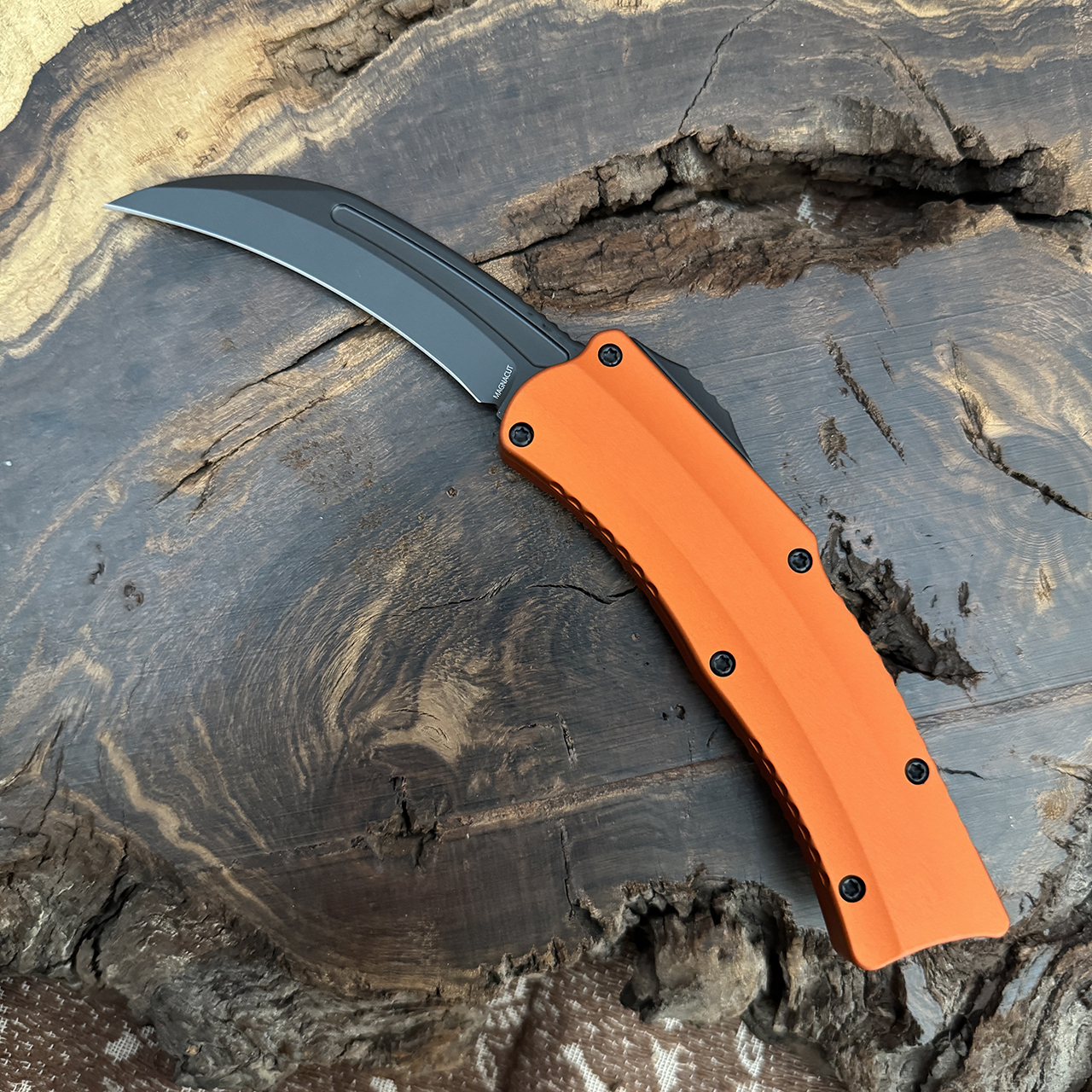 This model features a orange anodized aluminum handle scales and DLC black finished Magnacut stainless steel hawkbill blade.Black finished milled titanium roller ball pocket clip. The side of the frame is etched with the Heretic logo, model information, and serial number. Brand new in box.