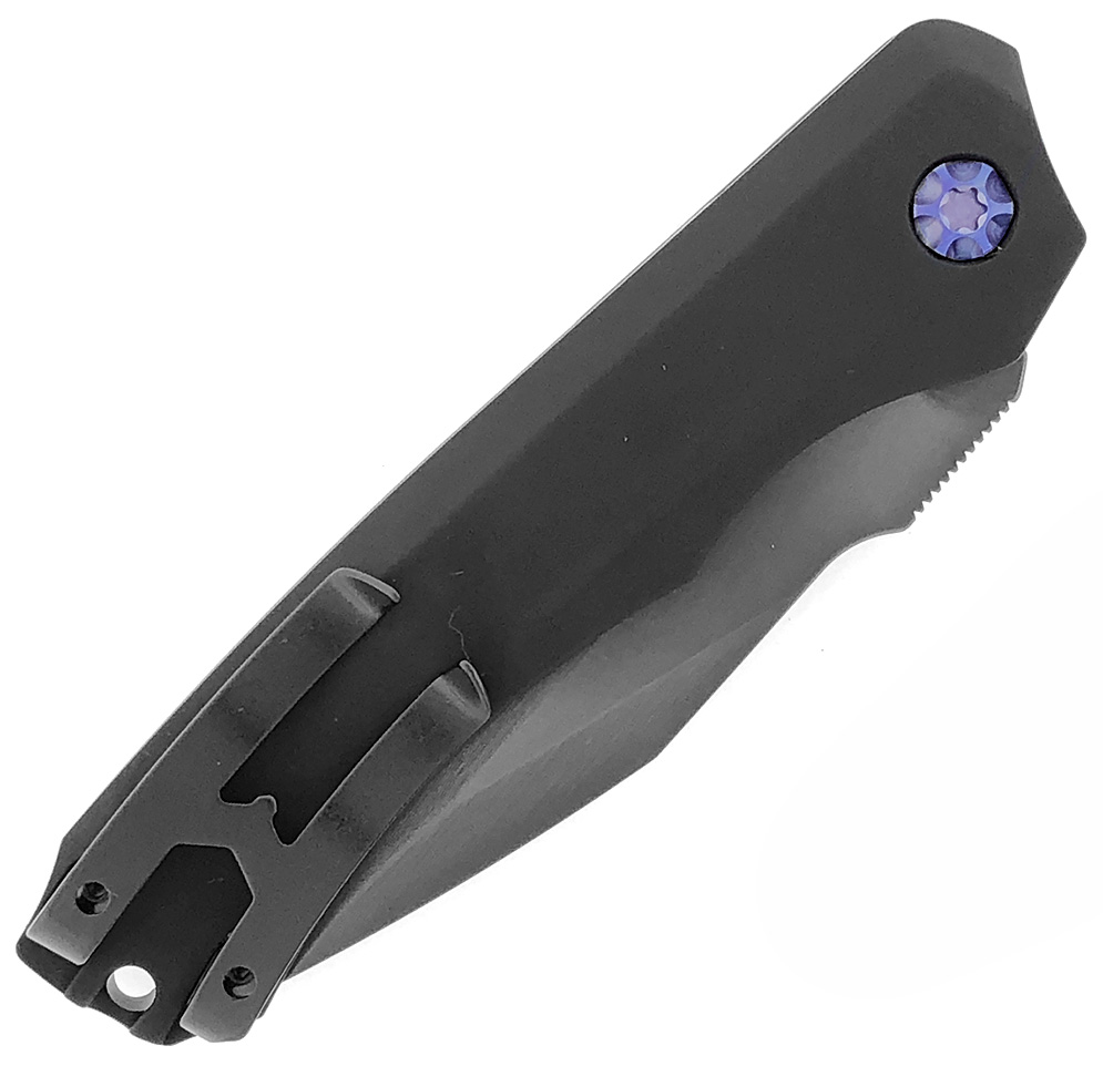 This model features an integral handle design milled from 6061-T6 Aluminum with a cutout for the carbon fiber bolster on the front side. Black DLC finished 154-CM stainless steel clip point blade. The blade is etched with the Heretic Knives logo, serial number, and model information. The interior of the handle is etched Heretic Knives. Blue Ti finished hardware. Black finished pocket clip. New in box with Heretic Knives cloth bag.