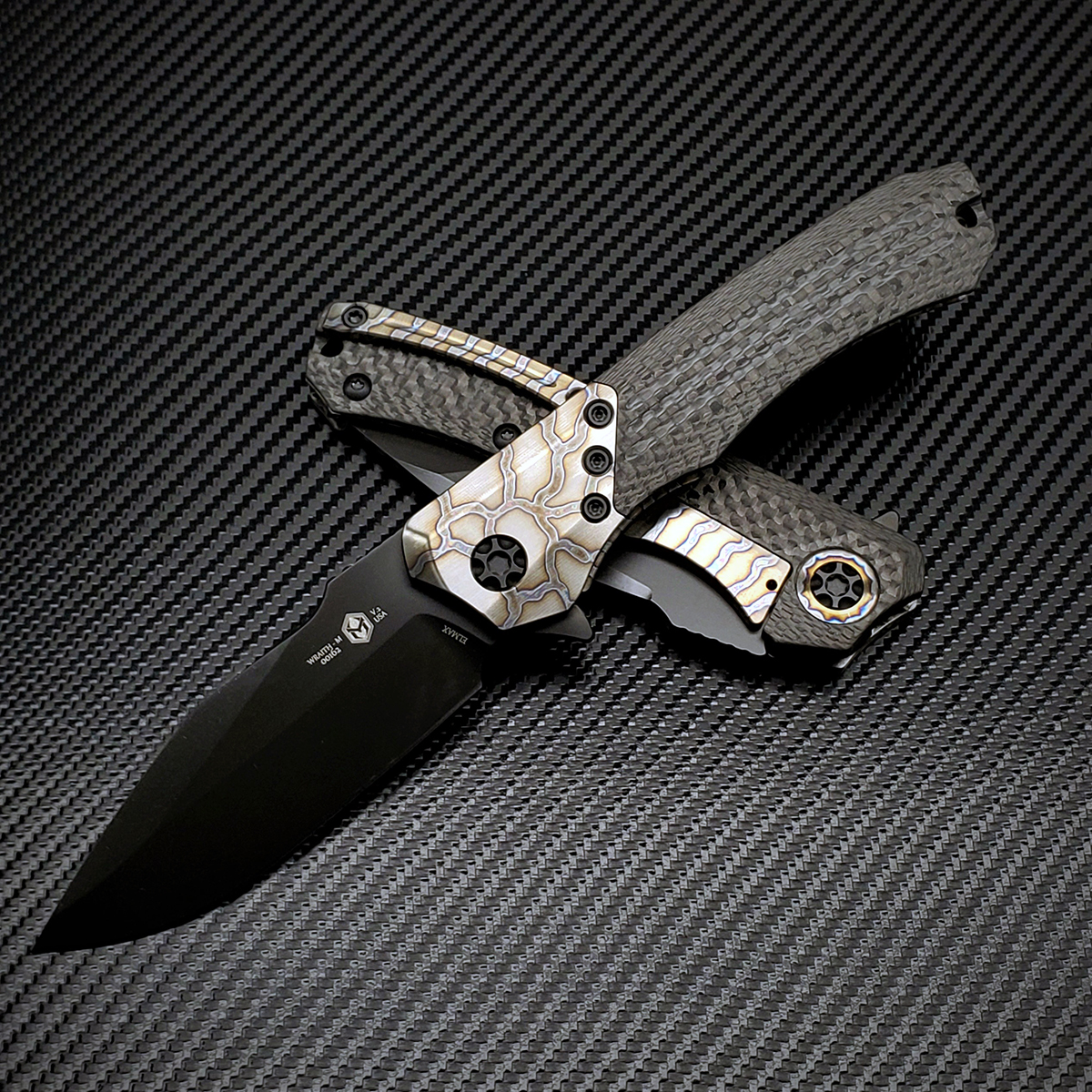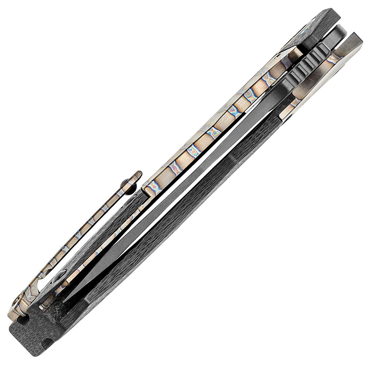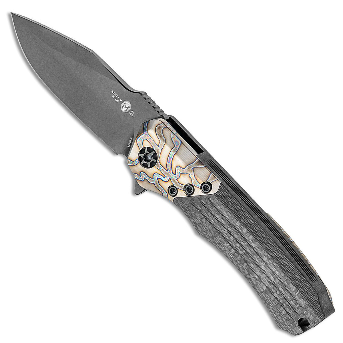 This model features an integral carbon fiber handle with a cutout for the hand flamed titanium bolster on the front side. Black DLC finished ELMAX stainless steel clip point blade. The blade is etched with the Heretic Knives logo, serial number, and model information. Black finished hardware. Matching hand flamed titanium pocket clip, lock bar, and pivot collar. An awesome version of the Wraith with some killer accents. Brand new in box.