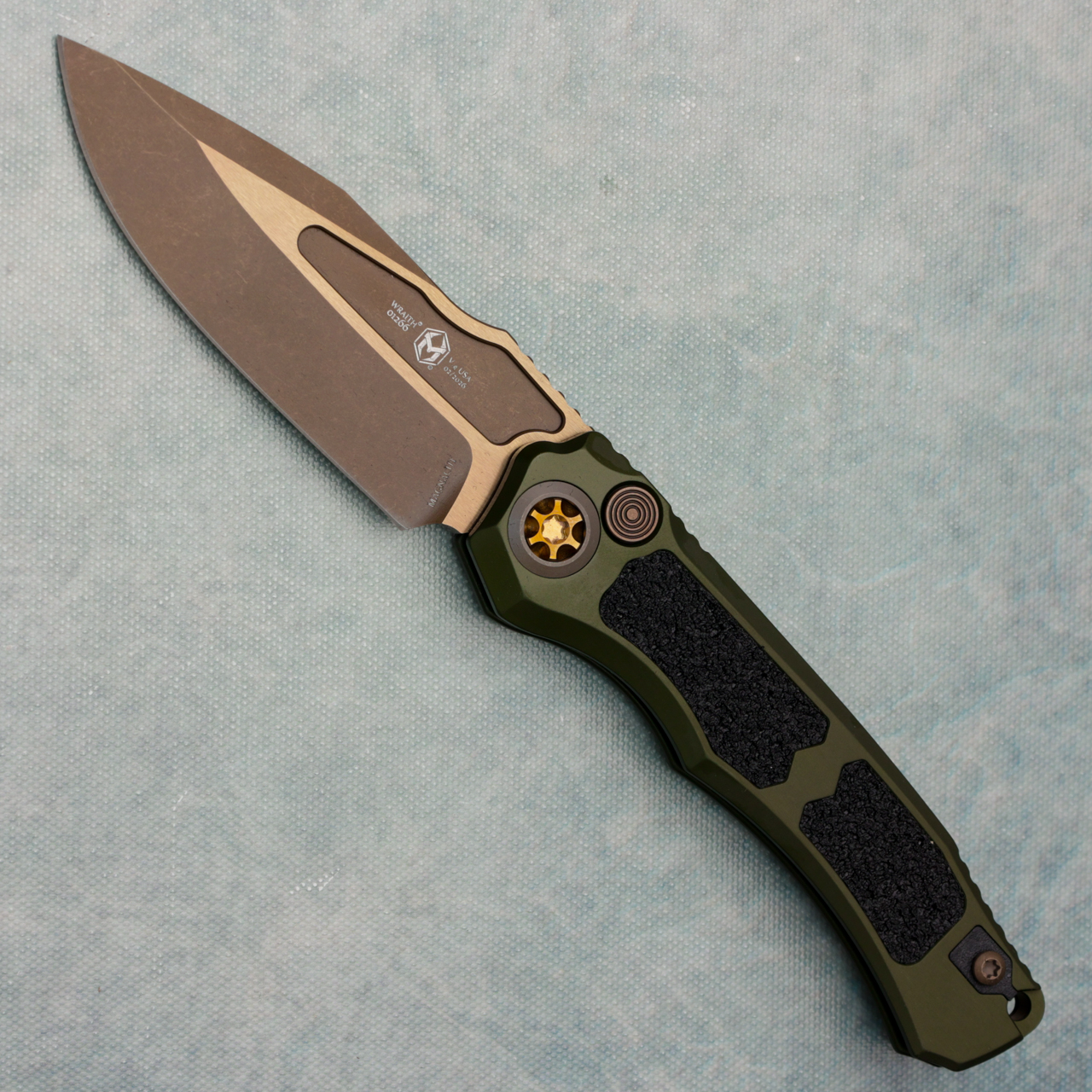 Heretic Knives Wraith V4 Auto Clip Point OD Green Handle w/ Black Grip Tape Inlays Bronze Blade H000-7A-GRN