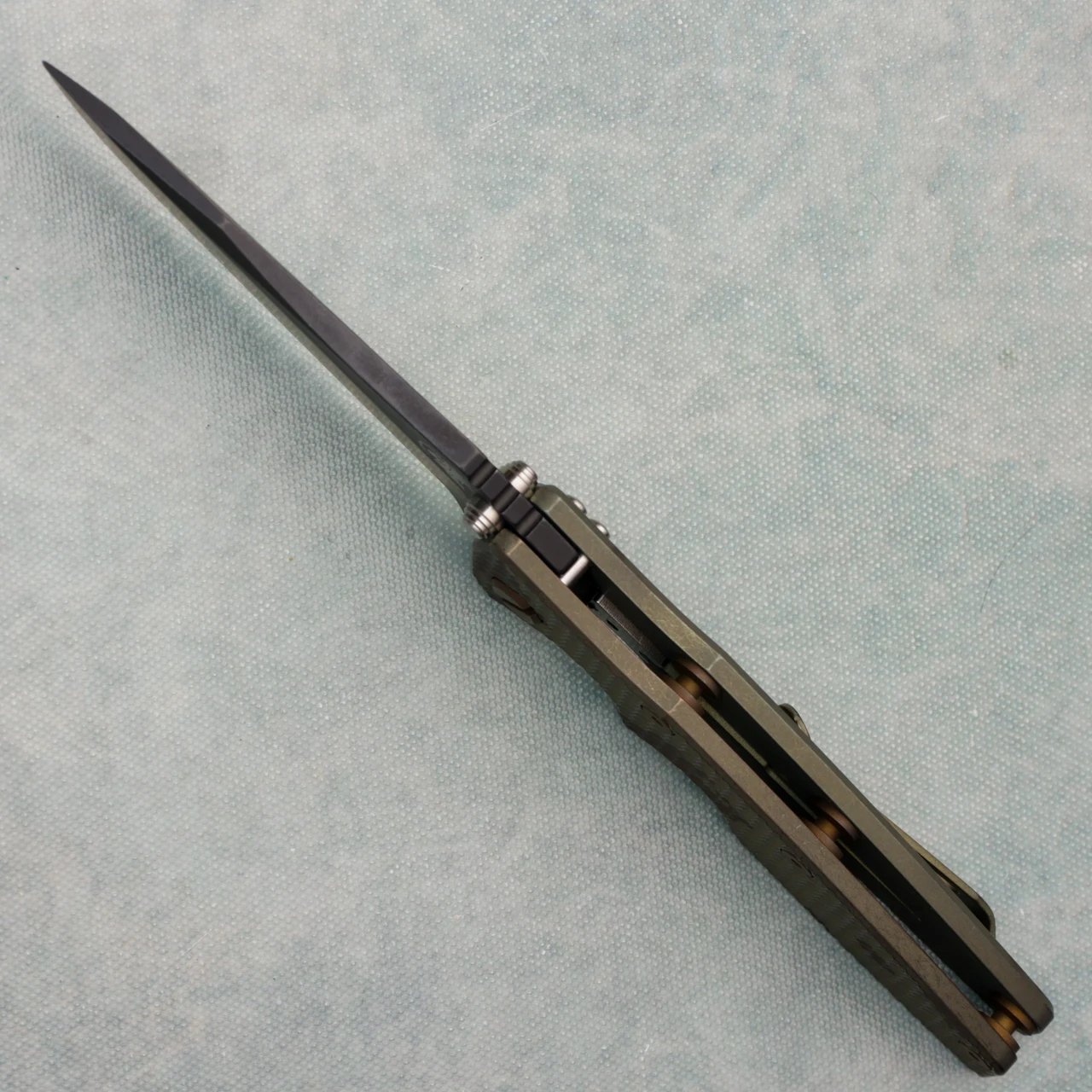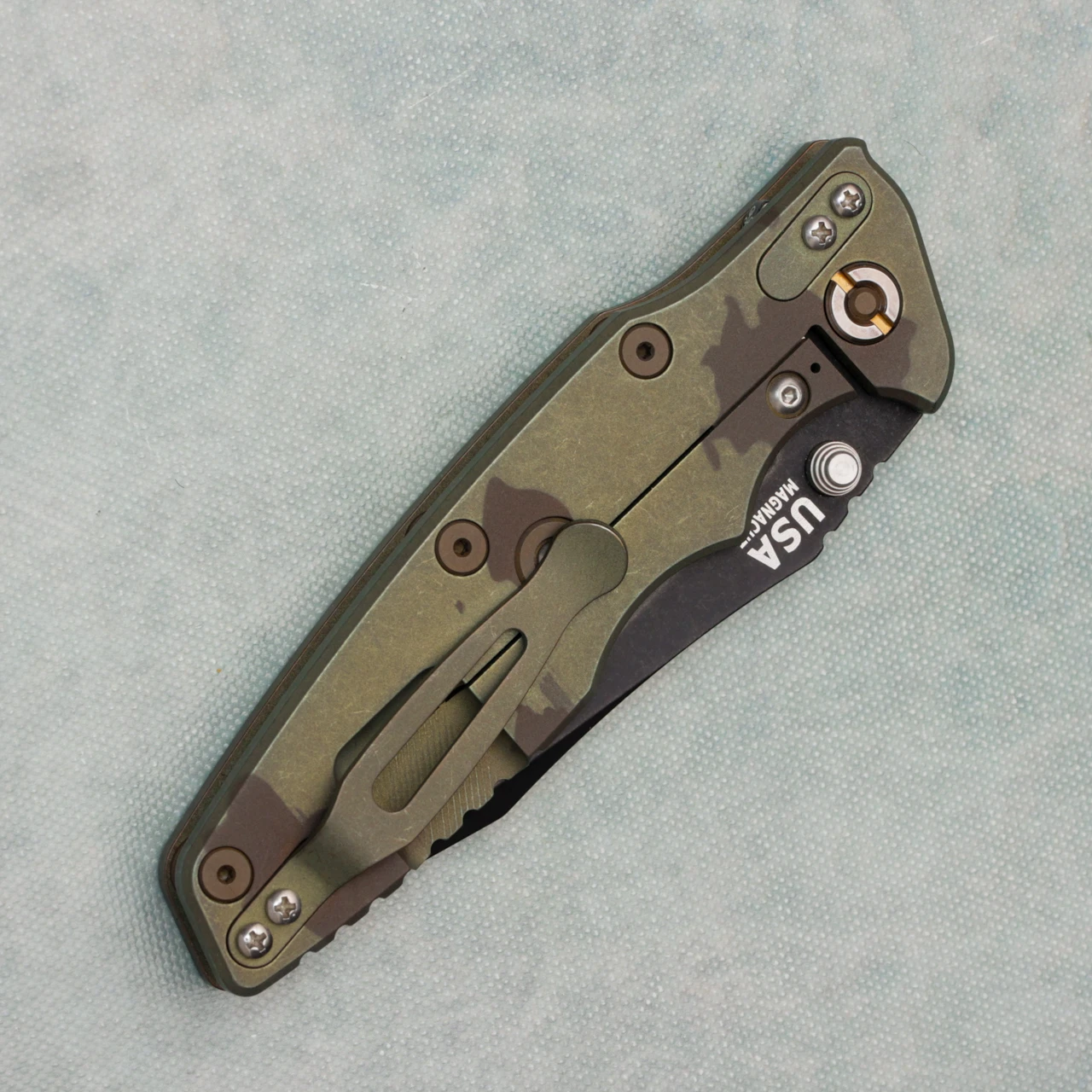 This version features a textured battle green and bronze titanium top handle scale and a battle green and bronze titanium back scale. Battle black finished MagnaCut stainless steel spearpoint blade. Tri-way pivot blade. Bronze hardware. Like new in box.