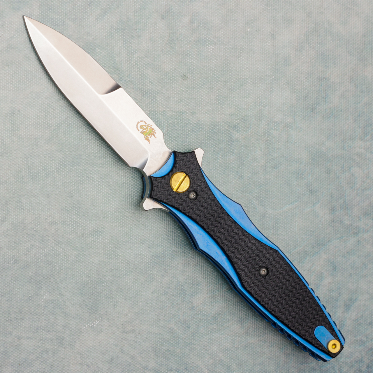 This version features blue anodized titanium handle scales with black g10 overlays. Stonewash finished 20CV stainless steel bayonet blade that is just sharpened on the one side. Bottom screw on front has some scratches, blade is in very good shape, no box.