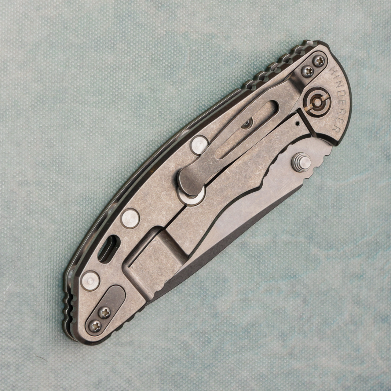 The Hinderer XM-18 is known as one of the toughest tactical folders. "Rick's focus when designing the XM-18 was a no nonsense tactical tool ready for the simplest cutting tasks to high speed low drag operations. The XM Series CNC flat ground Spanto blade is the best of both worlds offering maximum cutting potential in a blade that has a durable tip for prying; retaining its thickness right out to the tip. The oversized choil permits choking up on the blade for more precise work. The blade locks up on a solid ¼ in diameter Thumb stud which is press fitted into the blade. This makes for a very strong lockup as there is no loosening of the thumb stud which can happen with two piece designs. The fact that the thumb stud locks up against the frame adds an incredible amount of strength to the sideways torque of the blade as the sideways stresses are being stopped by the whole handle side, thus relieving the stress that would normally be put on the pivot."