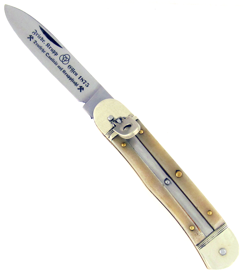 Nice smooth white bone handle scales. Mirror polished Krupp stainless steel spear point blade etched with the Hubertus Solingen Germany logo and the Krupp logo. Brass liners and handle pins. Nickel silver fluted bolsters and lever lock switch. The blade has good action. Awesome german made automatic pocket knife. New condition.