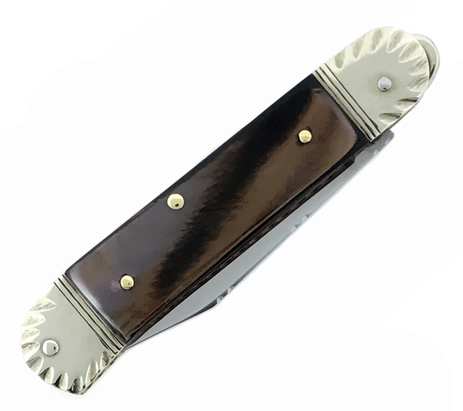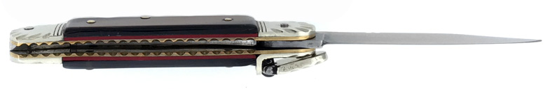 Classic Old school, German made, Hubertus springer automatic opening pocket knife. Beautiful genuine copper natural mother of pearl handle scales, this is some very rare colored pearl and it is awesome. Red micarta spacers. Polished Solingen stainless steel clip point blade. Nickel silver fluted bolsters with file work and lever switch. Brass file worked liners and handle pins. File worked spine and blade. This one is the perfect smaller sized pocket companion. A beautiful gentlemen's twist on a trusted classic knife. New!