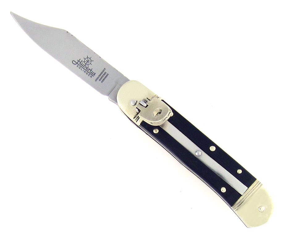 Real nice ebony wood handle scales. Mirror polished stainless steel clip point blade etched with the Hubertus Solingen logo. Nickel silver fluted bolsters, liners, handle pins and lever switch. Nice Hubertus gentlemens pocket knife with some custom filework on the spine of the blade. New condition.