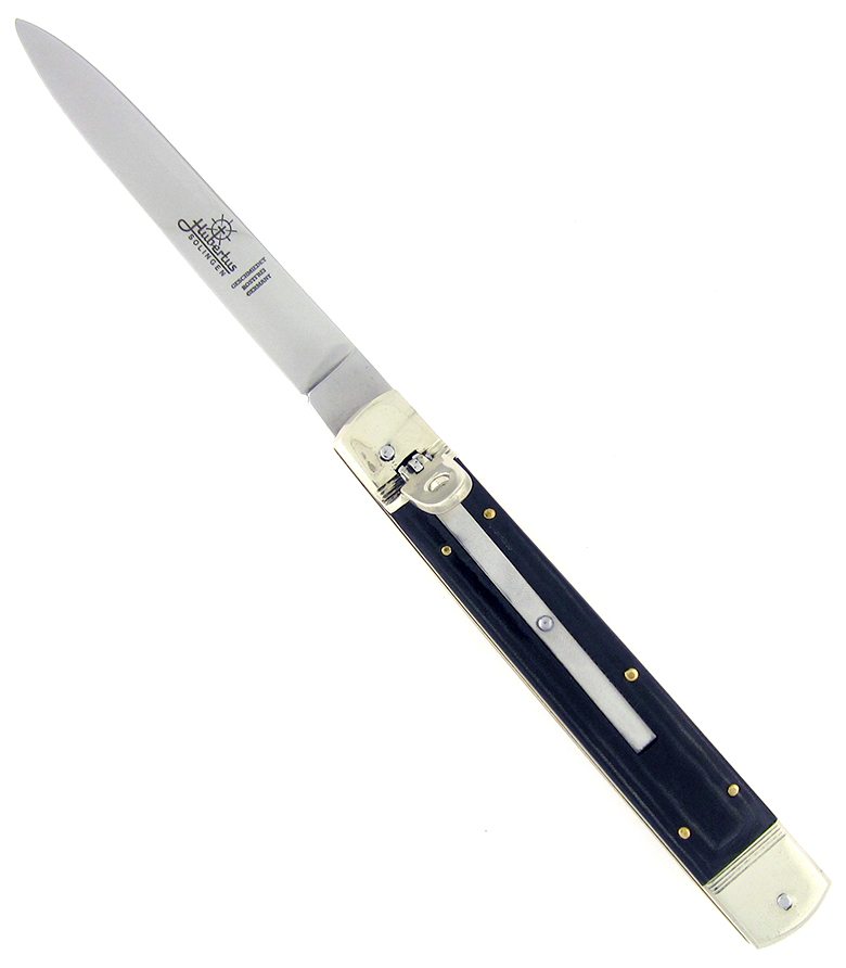 Real nice black linen micarta handle scales. Mirror polished stainless steel spear point blade etched with the Hubertus Solingen logo. Brass liners and handle pins. Nickel silver fluted bolsters and lever lock switch. These oversized auto's by Hubertus are badass. New condition.
