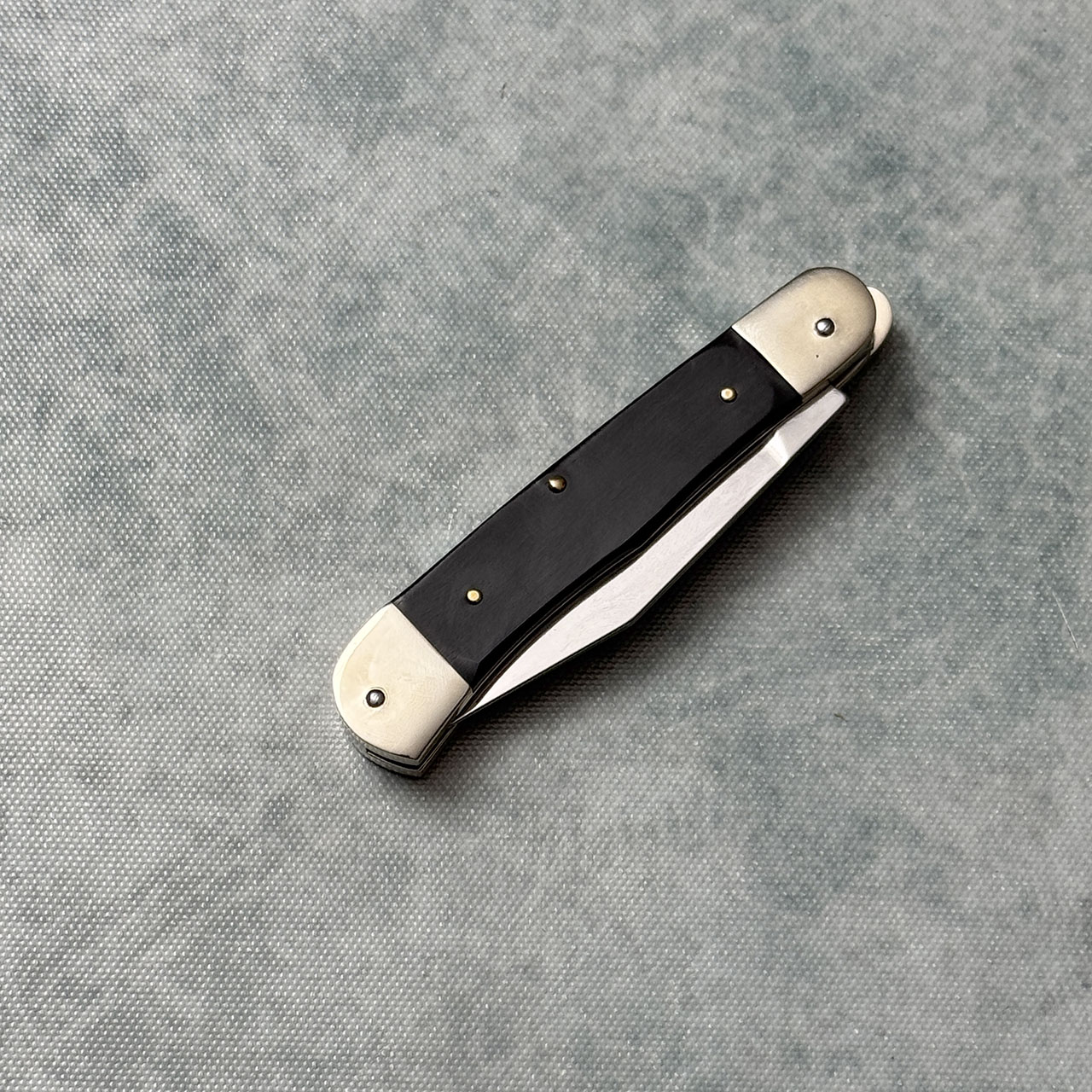 Beautiful ebony wood handle scales. Mirror polished stainless steel clip point blade etched with the Hubertus logo. Brass liners and handle pins. Nickel silver fluted bolsters and lever lock switch. The blade has good action. Really an awesome piece by made by Otter Messer. New in box.