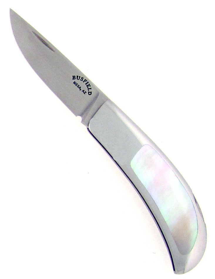 High class interframe lock back by John H. Jack Busfield. Mirror polished stainless steel frame with beautiful genuine mother of pearl inlays on both sides. Hand satin finished ATS-34 stainless steel blade. The blade is stamped BUSFIELD MESA, AZ - 008. Top notch fit and finish. John is making very few knives these days and his pieces are always sought after and very collectable. Mint condition with distressed cowhide leather slip pouch.