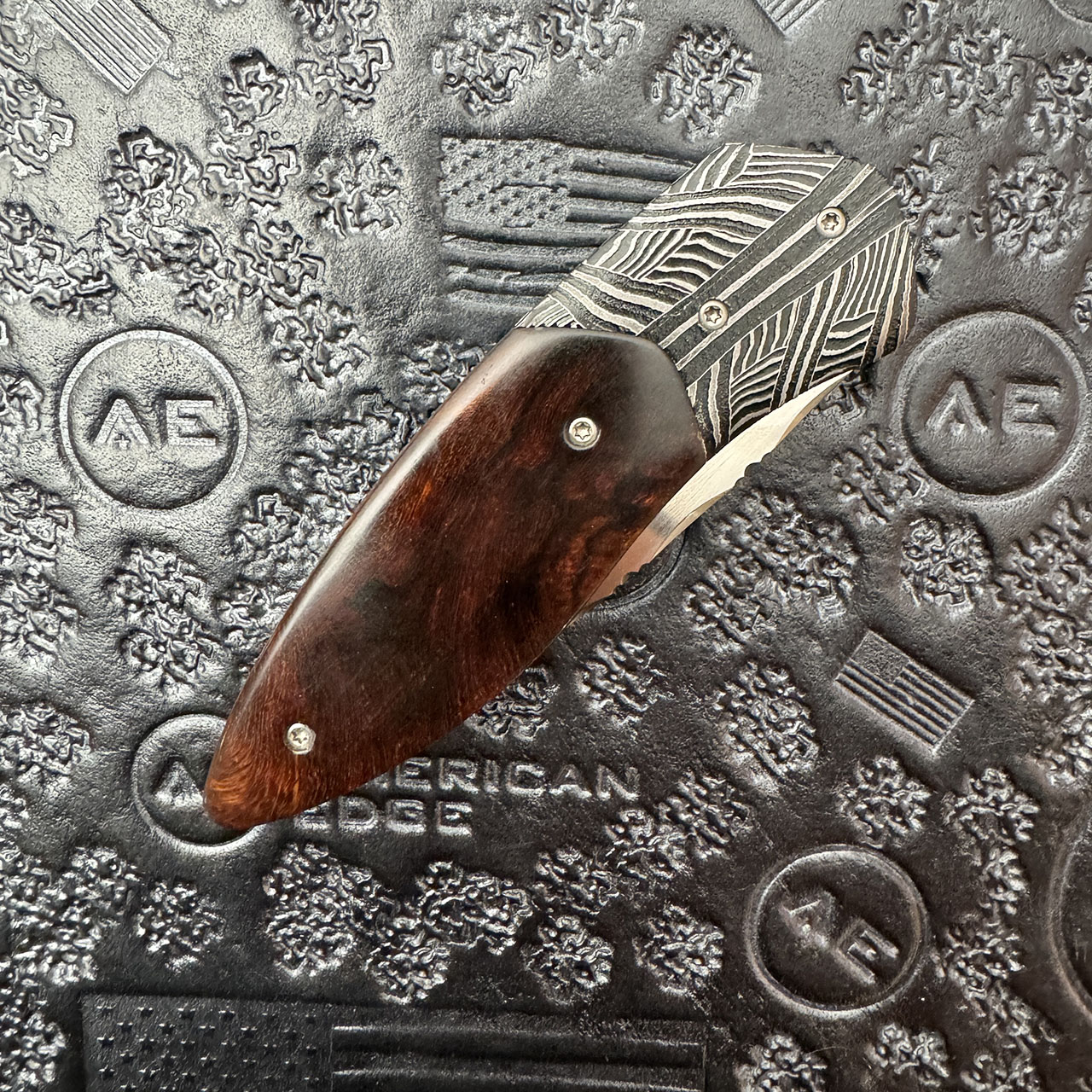 Jeremy Marsh Custom Knives Modelnumberthree Liner Lock Desert Ironwood Handle w/ Mosaic Damascus Bolsters Satin Blade (Consignment)