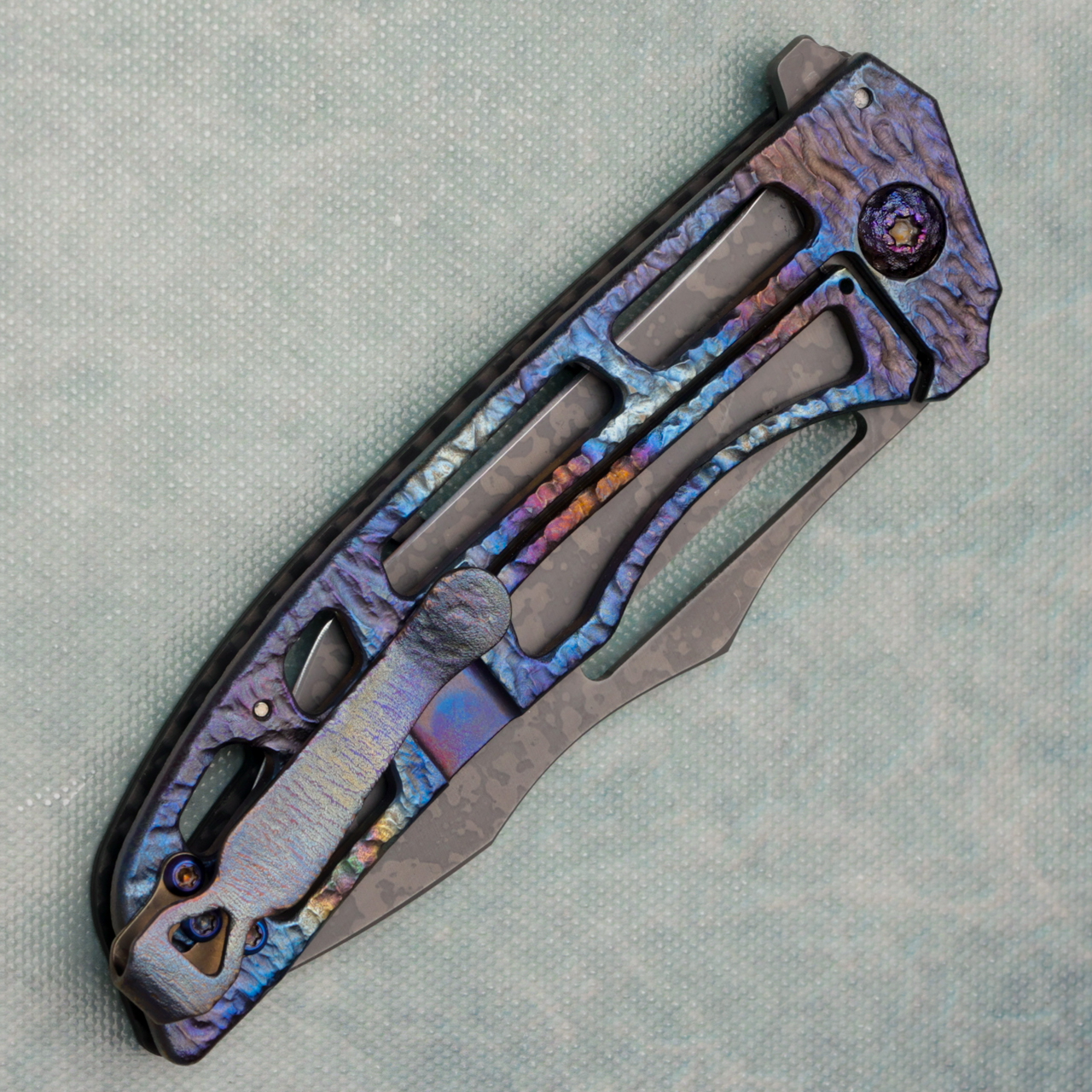 The Slitter is a new model from John Gray that features a rocked carbon fiber front scale and rocked, skeletonized blue/purple titanium lock side scale. This model has a flipper tab and hole for deployment. The blade is a dark camo finished CPM-Magnacut. Matching Lynch clip. Comes brand new in pouch.