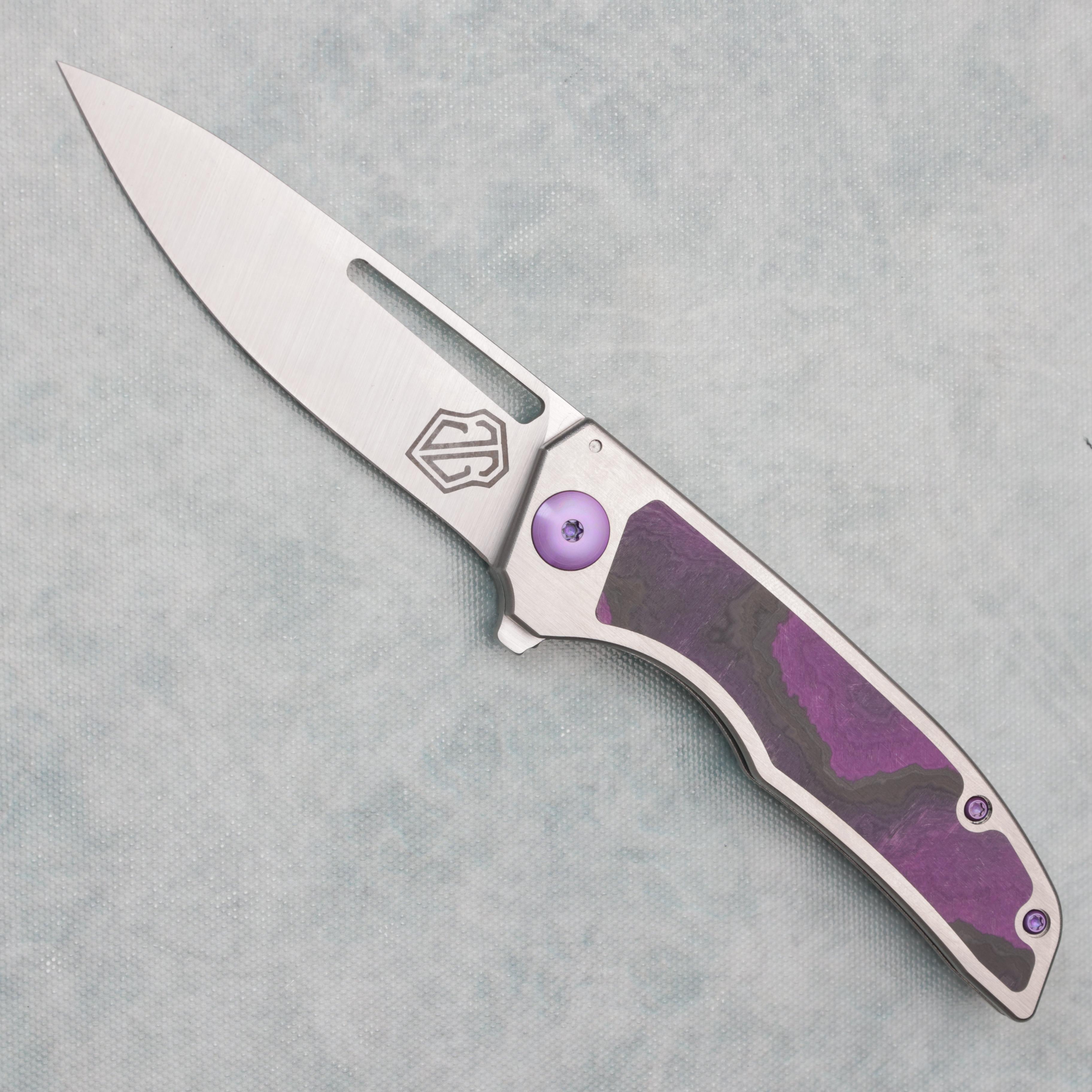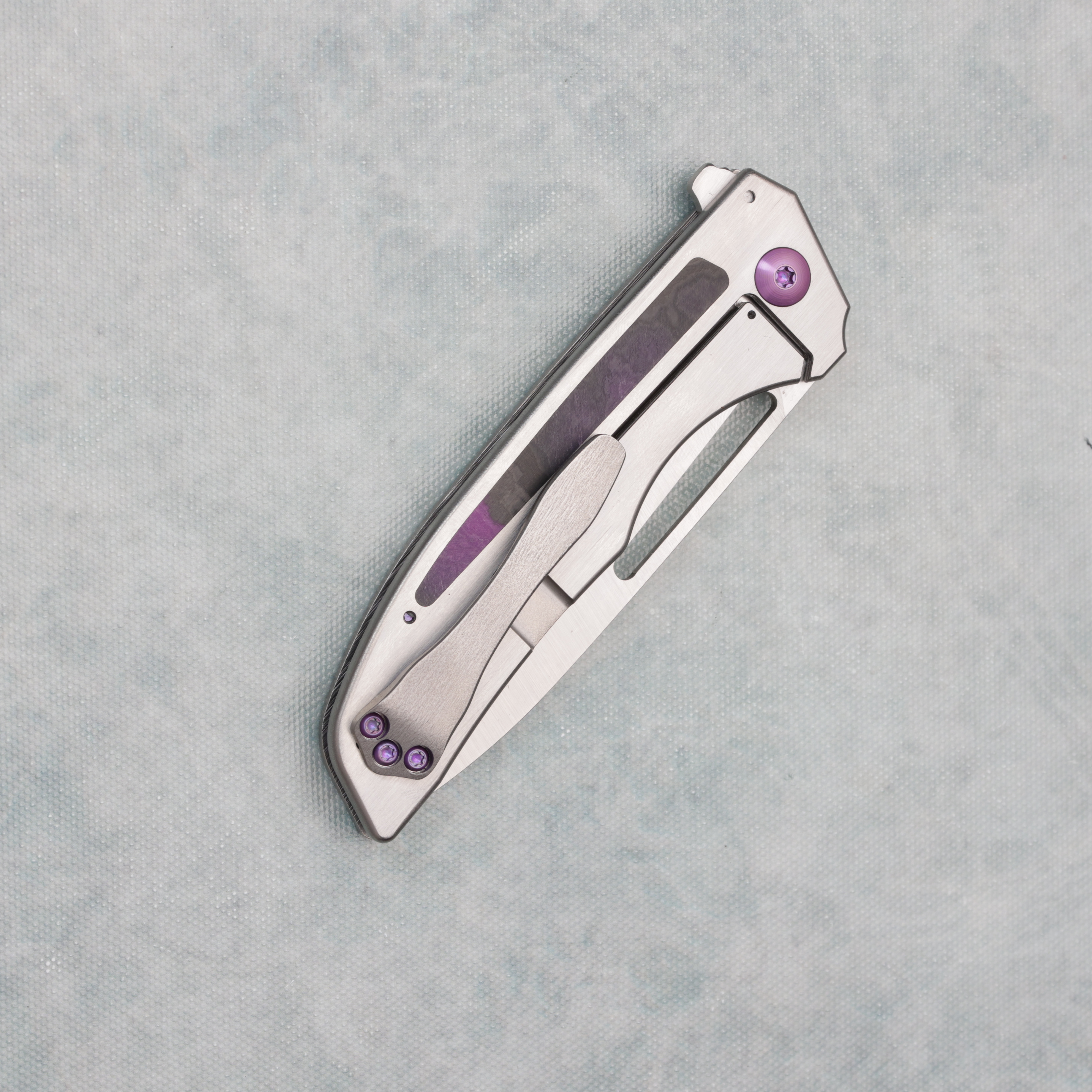 John Gray Custom Slitter Frame Lock Flipper Titanium Handle w/ Purple and Black Camo Quartz Inlay Satin Magnacut Blade
