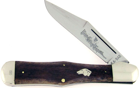Old Ka-Bar knives are highly sought after by collectors, because of their exceptional quality and added features. This one has nickel silver bolsters and inlaid nickel silver KA-BAR dogs head shield. Brass liners and handle pins. Mirror polished swedged stainless stainless clip point blade etched THE UNION - UNION CUTLERY COMPANY with long nail pull. The blade has good strong open, close, and half snap. Real nice smooth brown bone handle scales. The Serial Number #190 is etched on the rear bolster. Proudly made in Olean, New York USA in 1992. This is one great old knife anyone would love; especially Ka-Bar collectors. Mint condition.