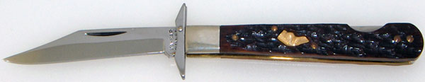 Limited edition serial numbered #xxx of only 250 ever made. Awesome jigged brown bone handles. Inlaid solid 14K gold dog's head Ka-Bar shield that says KA-BAR. High polished stainless steel clip point blade and swinging guard. Tang stamped KA-BAR OLEAN N.Y. - 110. Nickel silver bolsters. Brass liners and handle pins. Beautiful Ka-Bar knife born in June of 1985. Comes in original Ka-Bar hard shell display box with sleeve over it.