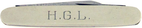 Satin finished nickel silver handle scales etched on the back with the initials H.G.L. High carbon steel spear point blade and pen blade. Both blades have good strong snap and light pitting. Excellent pocket knife with a slim design and lots more room for personalized engraving.