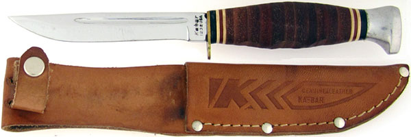 Nice finger grooved stacked leather handle, the leather is tight with red, white, and black handle spacers. Polished stainless steel clip point hunting blade with blood grooves on both sides. Tang stamped KABAR 1232 USA. Brass finger guard and aluminum pommel. Lightly used but in excellent condition. Comes with a sheath but not the original sheath that is pictured.