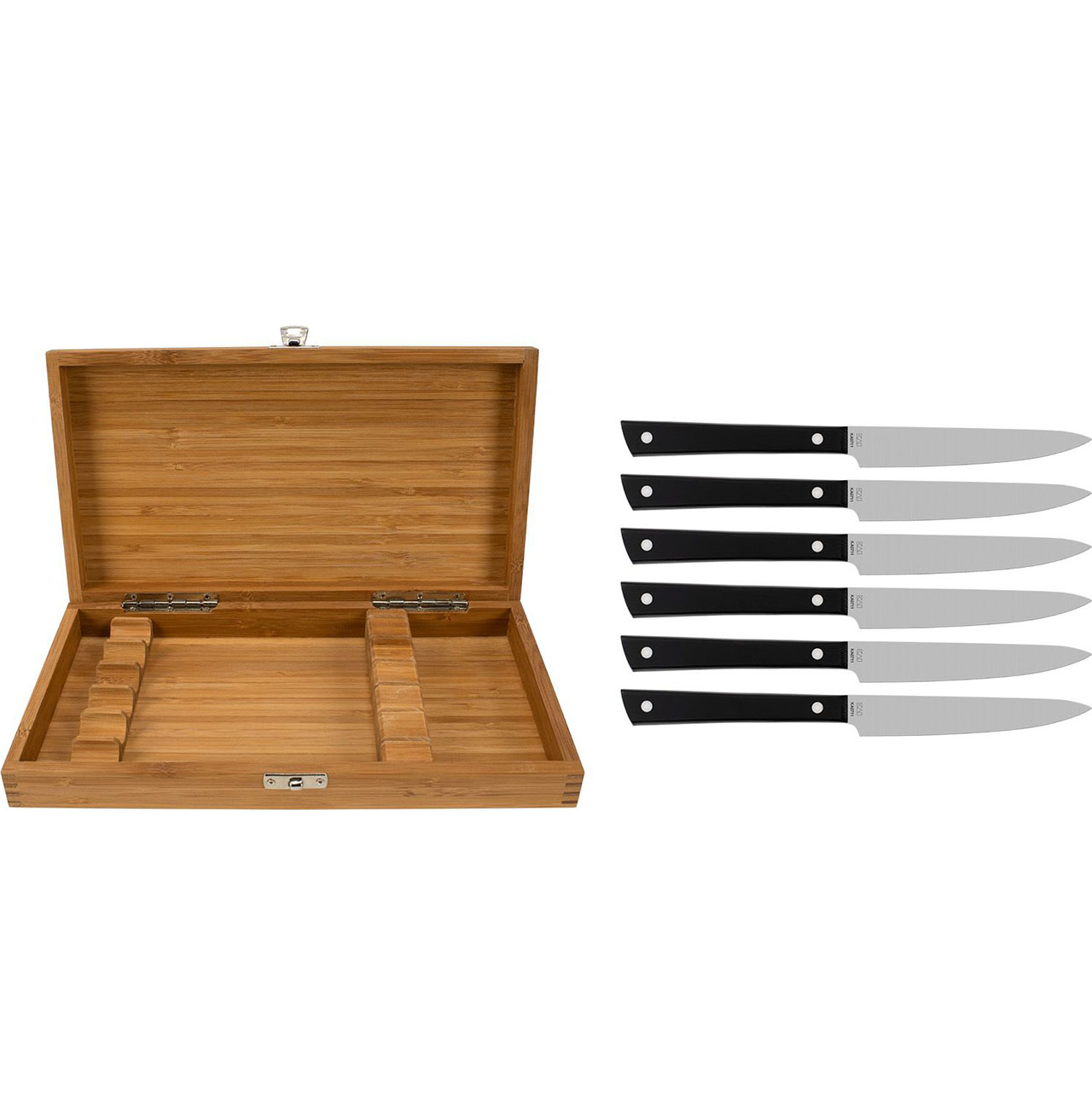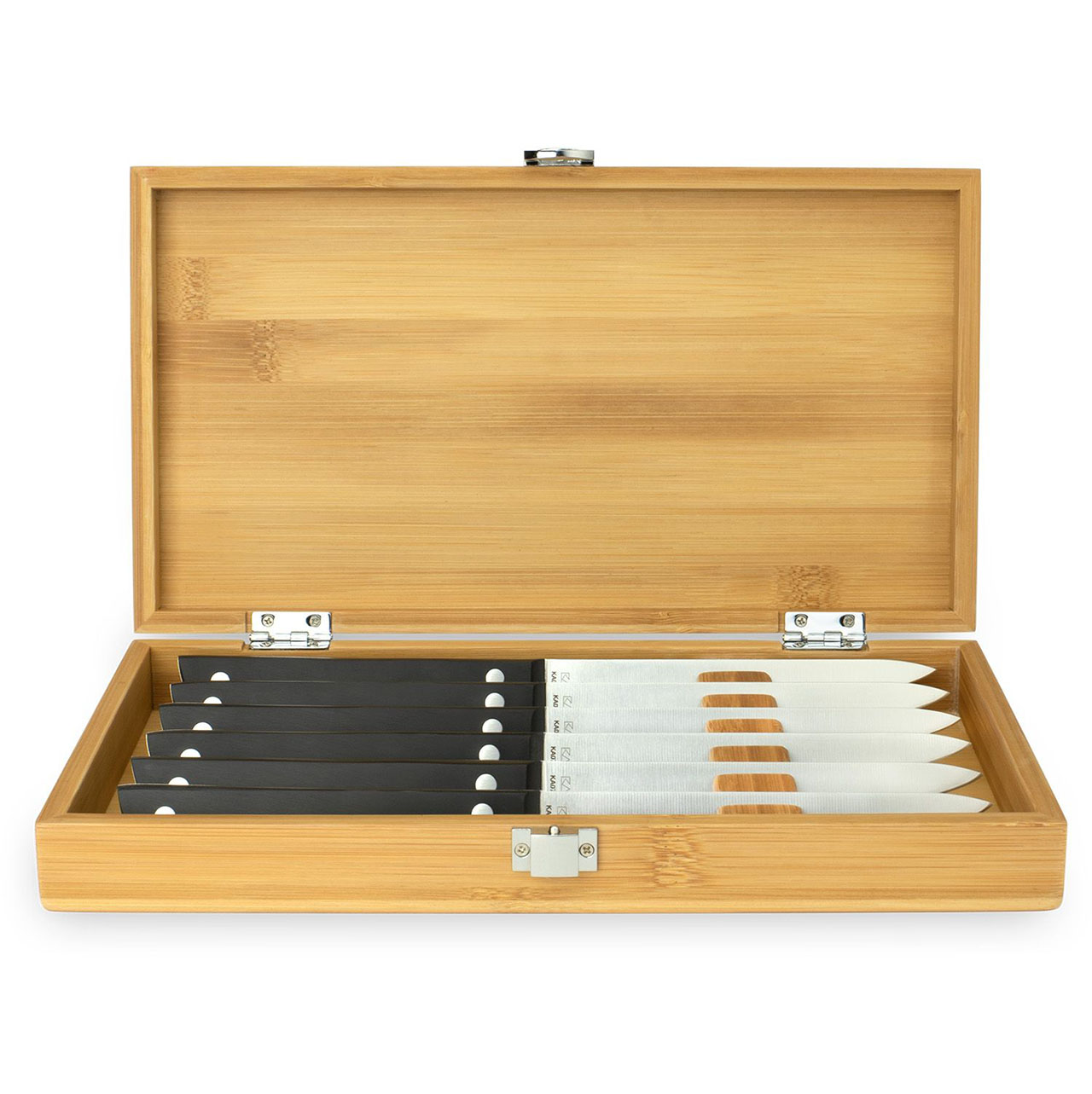 Your steak deserves a Kai Steak Knife. With its razor sharp, fine edge, it cuts through steaks with ease. No serrations are needed. The Kai Steak Knife's 16° edge cuts cleanly, which means more of the flavorful juices stay inside the meat—and your steak tastes better than ever. This beautiful 6-piece steak knife set is perfect for family dinners, dinner parties, backyard barbecues, and more. You and your family or guests will appreciate the smooth, controlled feel of the knife as you cut. The right sized 5.25 inch blade handles steaks of all sizes. The slim 4.75 inch handle is comfortable for hands large and small. The 6-Piece Kai Steak Knife Set comes with 6 beautiful knives and an elegant bamboo presentation or storage box. New in box.