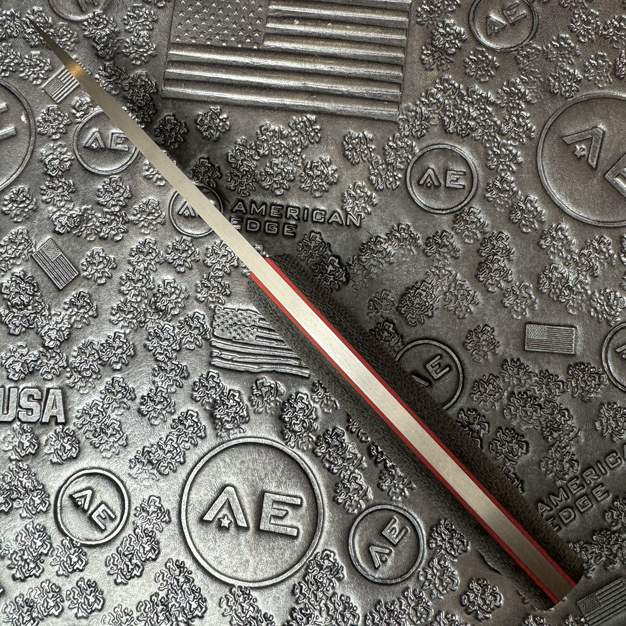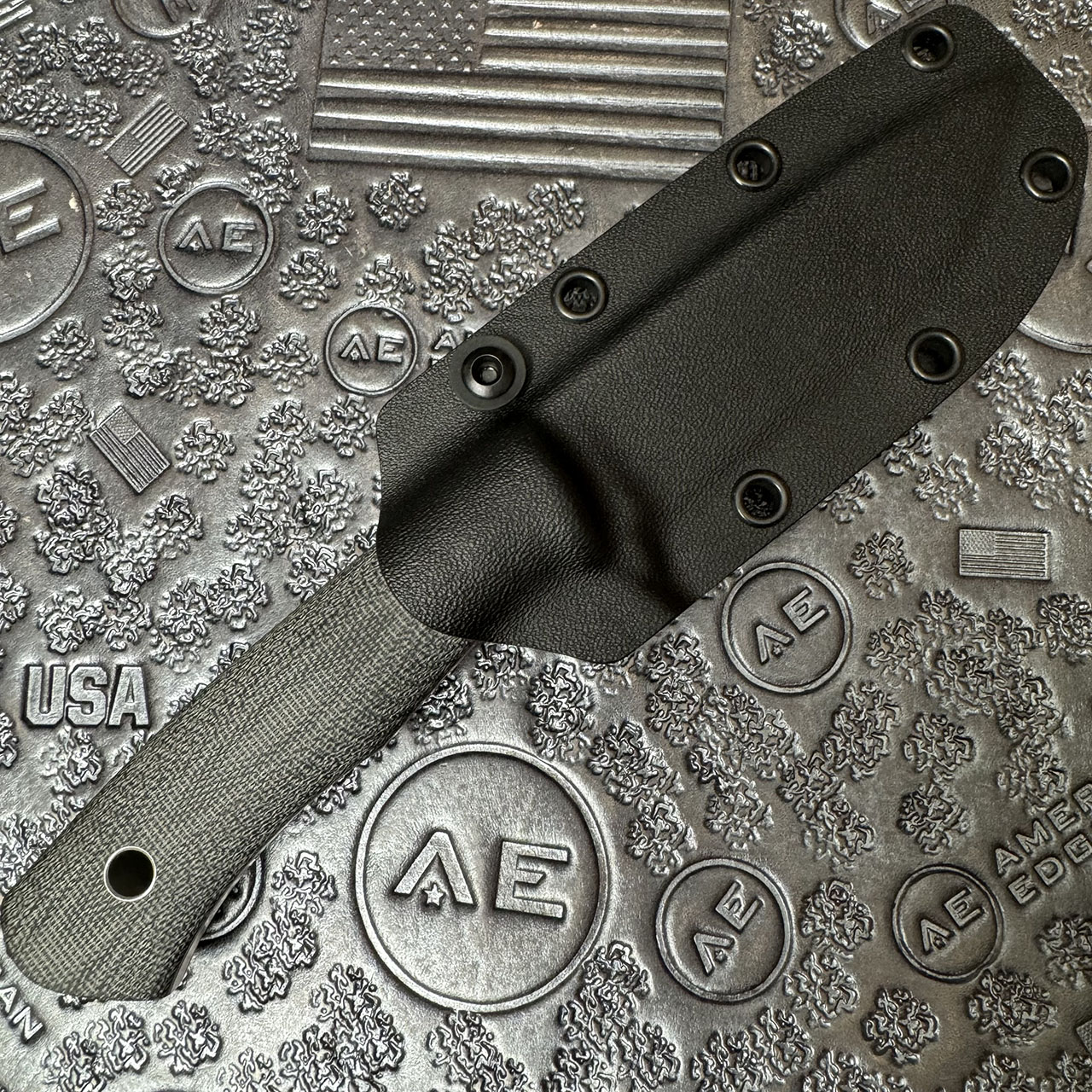 This custom traveler from Kamil Dlugosz Custom Knives has a hand satin Elmax blade, black canvas micarta handles with red G10 liners. Feels absolutely amazing in hand! Nice solid weight. Comes with black kydex sheath. This is a beautiful custom fixed blade! Brand new from maker with leather zip up pouch.