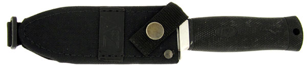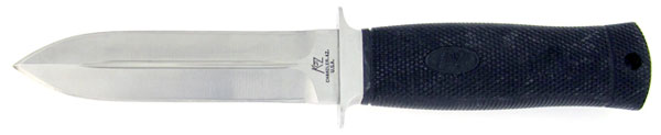 Black checkered kraton handle with the Katz logo stamped on both sides. Stainless steel double edged dagger blade with blood grooves on both sides. Stainless steel double guard. Lanyard hole. Comes with a nice black nylon and leather Katz boot clip sheath.