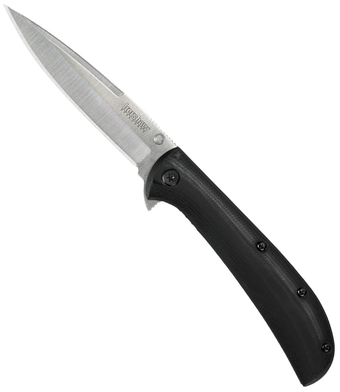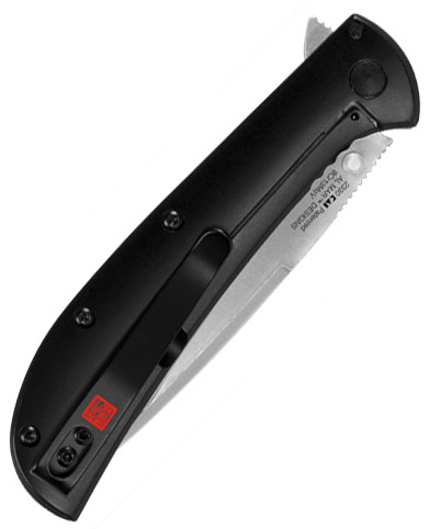 The AM-4 features SpeedSafe assisted opening for quick and simple one-handed opening. Just pull back on the flipper or push on the thumbstud. The blade is quality 8Cr13MoV stainless steel with a handsome satin finish and a top swedge. The front handle scale is G-10 crowned and polished for a smooth feel and classy look. The back is pure steel with a sturdy frame lock to keep the blade in position until you release it. The AM-4 also features a deep-carry pocketclip with Al Mar Knives red logo emblem and for an extra measure of visual interest Kershaw used red standoffs.