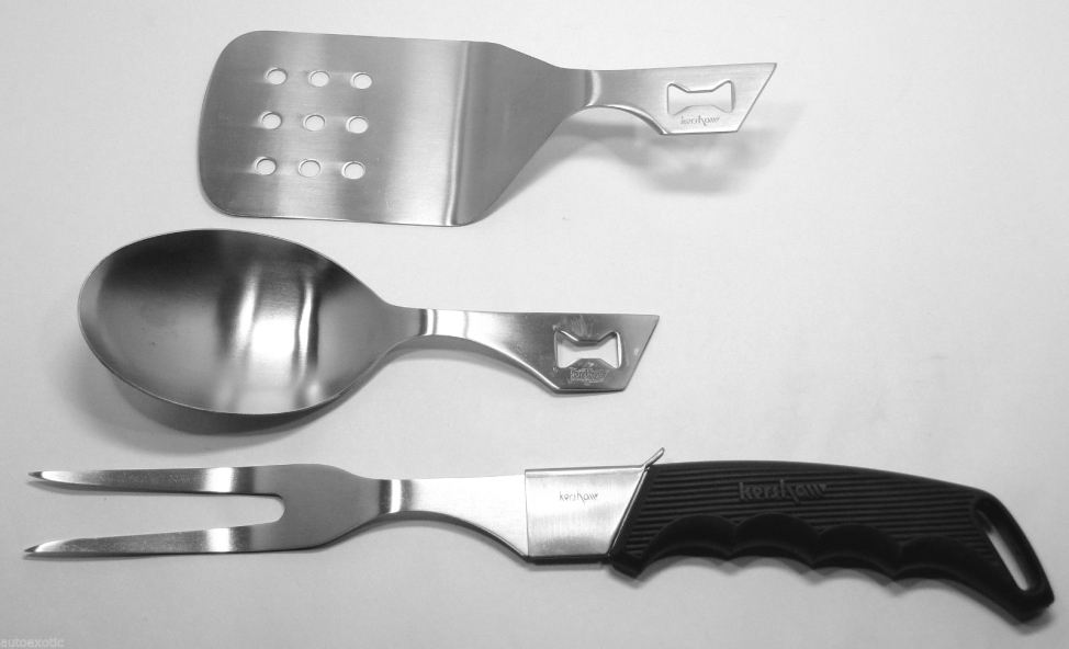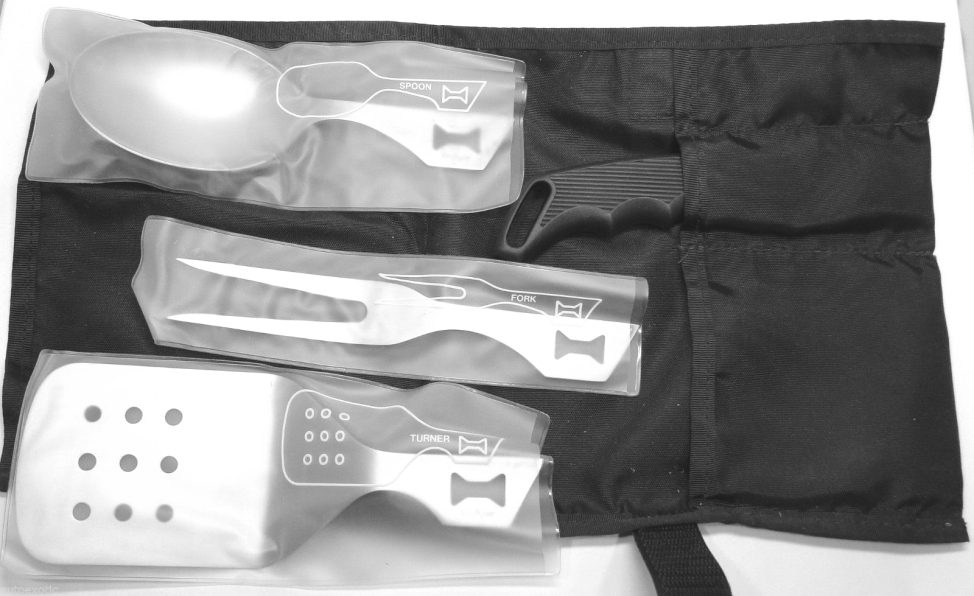 The ultimate camping cooking travel kit - this clever design includes an easily carried 3 piece set with locking handle design. The handle holds each utensil very securely as it locks it down over the matching shape of tool end. Compact and professional. Includes one large spoon, one large fork and one turner (spatula) plus the interchangeable handle and the carrying case. Each utensil has its own plastic sleeve and then they slide into the pockets of the soft foldable pouch. Folds down to 8 x 5 bundle. This high quality set is great for portable setups like camping, parties, cookouts and bbqs. Brand new in original box.