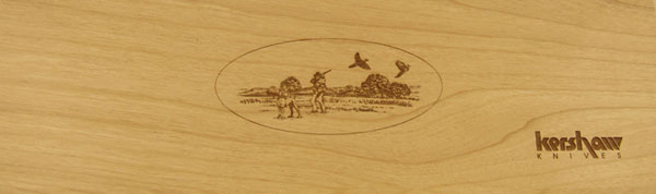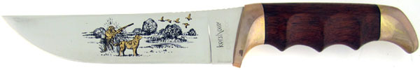 This is a limited edition knife. Finger grooved rosewood handles with black handle spacers. Stainless steel upswept drop point hunting blade etched Ducks hunting scene with a Golden Retreiver dog and hunter. The hunter, dog and ducks are etched in gold. Tang stamped KERSHAW 0XXX/1000. Copper finger guard and pommel. This beautiful knife is serial numbered #0XXX out of only 1000 made and is part of the Kershaw Hunting Dog Collectible Series. Thumb jimping on the spine. Comes brand new in a nice quality wooden display box.