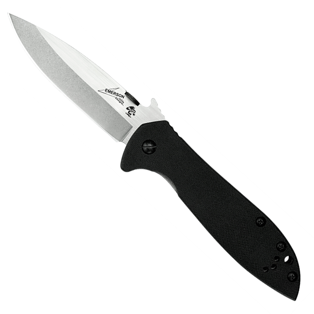 This is a manual opening knife using either the thumb disk or the patented Emerson Wave Feature. A small wave-shaped tab on the top of the blade is built to catch on the pocket seam, opening the knife as it comes out of the pocket. This instant-open feature is a favorite among military, rescue, and law enforcement knife users. Includes a lanyard hole and a pocket clip that is reversible for left or right handed tip up carry. Brand new in box.