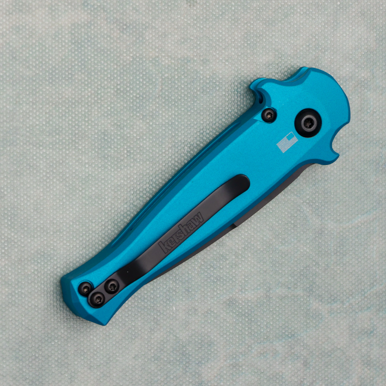 This model features teal anodized 6061-T6 aluminum handle scales with a carbon fiber inlay on the front side. Black finished CPM-154 stainless steel bayonet style spear point blade. The handle is marked on the back with the American Flag logo. The blade is marked with the model information. Black hardware and pocket clip marked Kershaw. Brand new in box.