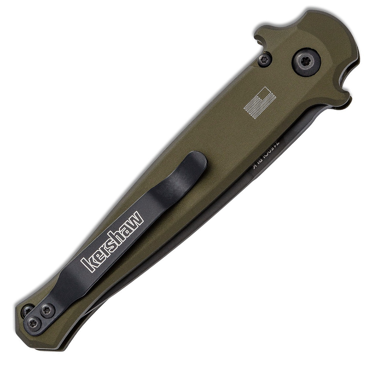 This model features olive green anodized 6061-T6 aluminum handle scales with a carbon fiber inlay on the front side. Black finished CPM-154 stainless steel bayonet style spear point blade. The handle is marked on the back with the American Flag logo. The blade is marked with the model information. Black hardware and pocket clip marked with the Kershaw logo. Brand new in box.